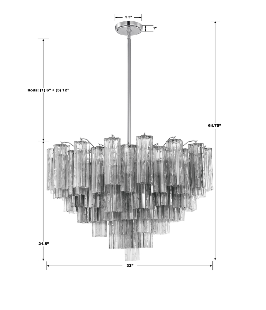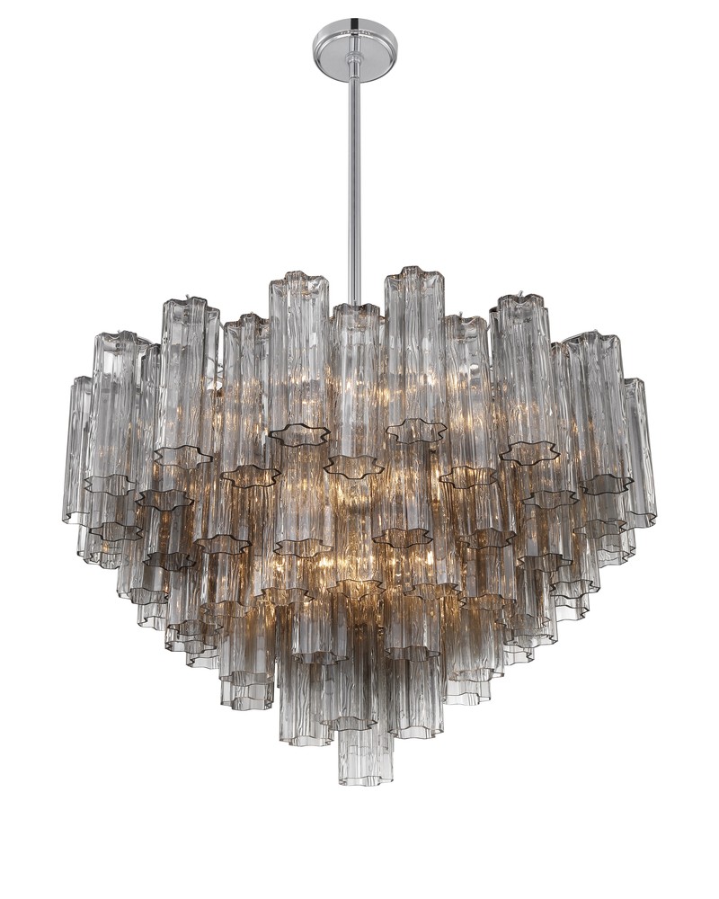 The captivating Addis Lighting Collection is a modern-day interpretation of the iconic mid-century Tronchi chandelier. Inspired by its predecessor's sleek lines and geometric shapes, the Addis features a polished Chrome or Aged Brass metal frame that exudes sophistication and style. Its unique design showcases transparent tiers of textured Tronchi glass tubes, forming a mesmerizing 5-point rounded star shape. Choose from a range of glass colors, including clear, amber, smoke, and white, or the stunning Autumn option, which features a captivating multicolor disposition of amber, clear, and smoke Tronchi glass. The Addis Lighting Collection offers various sizes and finishes, allowing you to find the perfect fit for your space while adding a touch of timeless elegance.