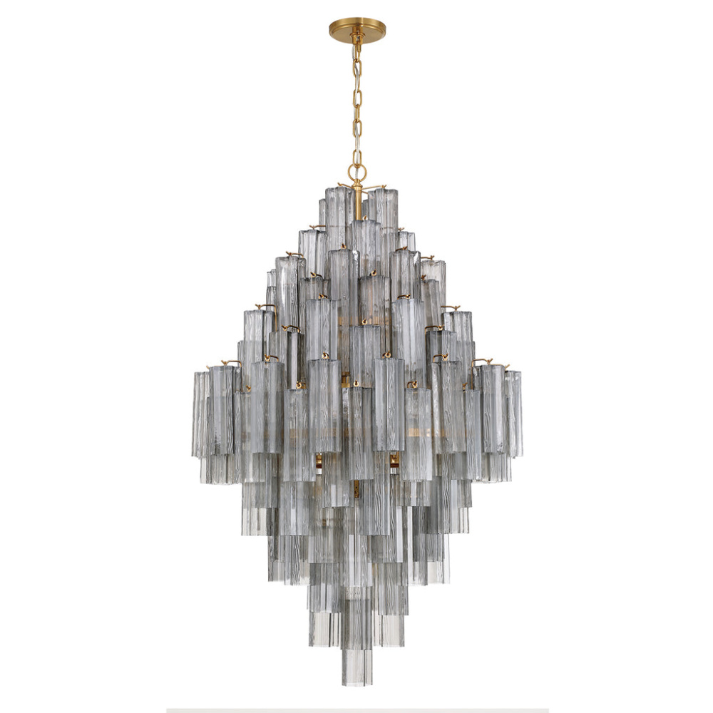 The captivating Addis Lighting Collection is a modern-day interpretation of the iconic mid-century Tronchi chandelier. Inspired by its predecessor's sleek lines and geometric shapes, the Addis features a polished Chrome or Aged Brass metal frame that exudes sophistication and style. Its unique design showcases transparent tiers of textured Tronchi glass tubes, forming a mesmerizing 5-point rounded star shape. Choose from a range of glass colors, including clear, amber, smoke, and white, or the stunning Autumn option, which features a captivating multicolor disposition of amber, clear, and smoke Tronchi glass. The Addis Lighting Collection offers various sizes and finishes, allowing you to find the perfect fit for your space while adding a touch of timeless elegance.