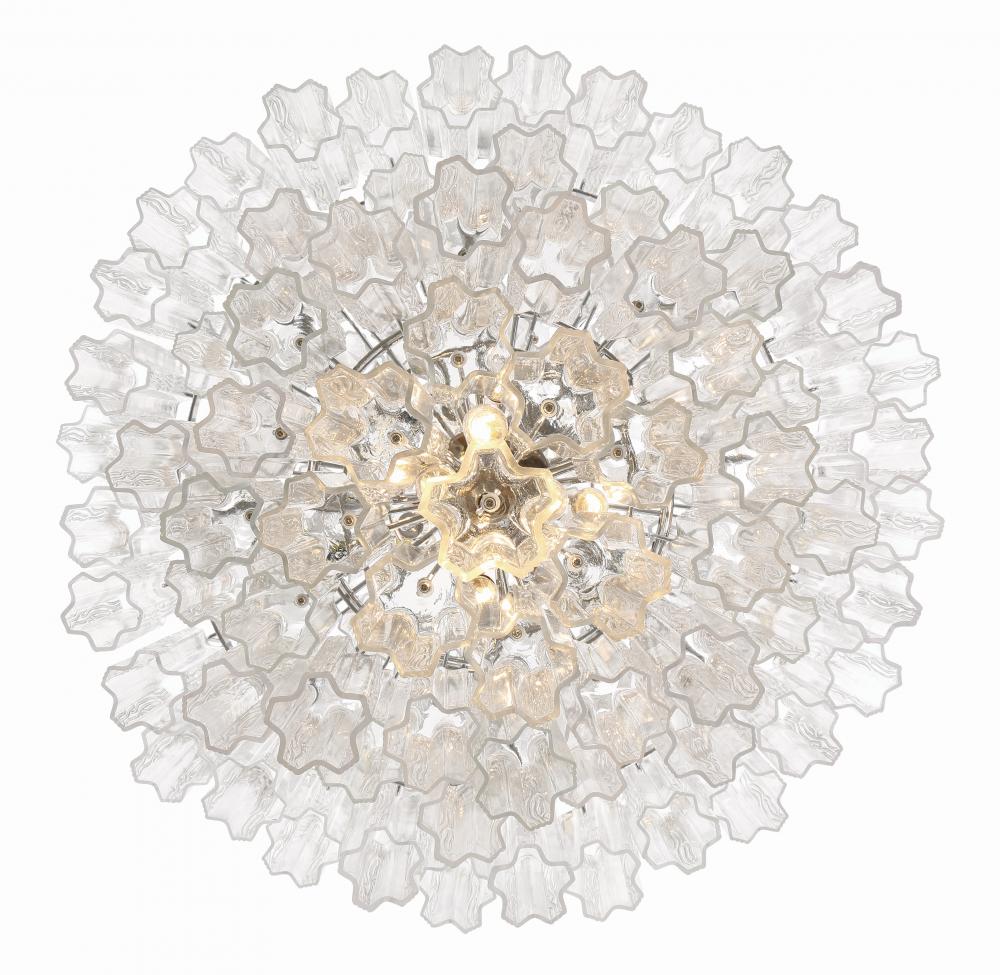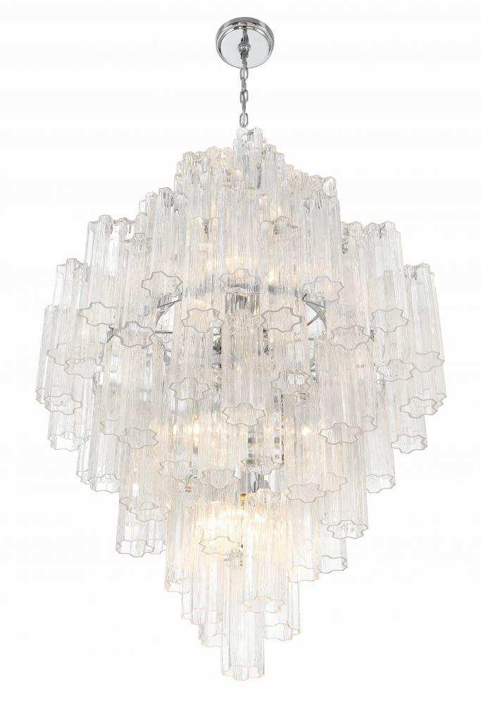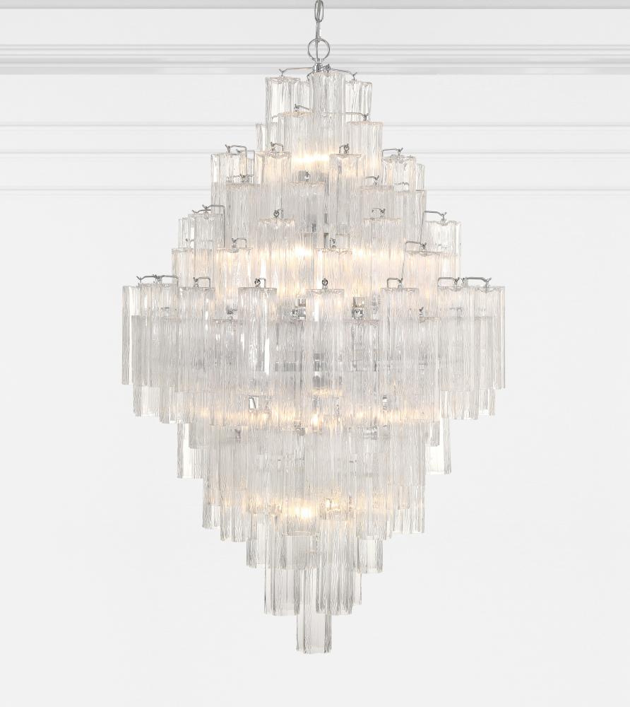 The captivating Addis Lighting Collection is a modern-day interpretation of the iconic mid-century Tronchi chandelier. Inspired by its predecessor's sleek lines and geometric shapes, the Addis features a polished Chrome or Aged Brass metal frame that exudes sophistication and style. Its unique design showcases transparent tiers of textured Tronchi glass tubes, forming a mesmerizing 5-point rounded star shape. Choose from a range of glass colors, including clear, amber, smoke, and white, or the stunning Autumn option, which features a captivating multicolor disposition of amber, clear, and smoke Tronchi glass. The Addis Lighting Collection offers various sizes and finishes, allowing you to find the perfect fit for your space while adding a touch of timeless elegance.