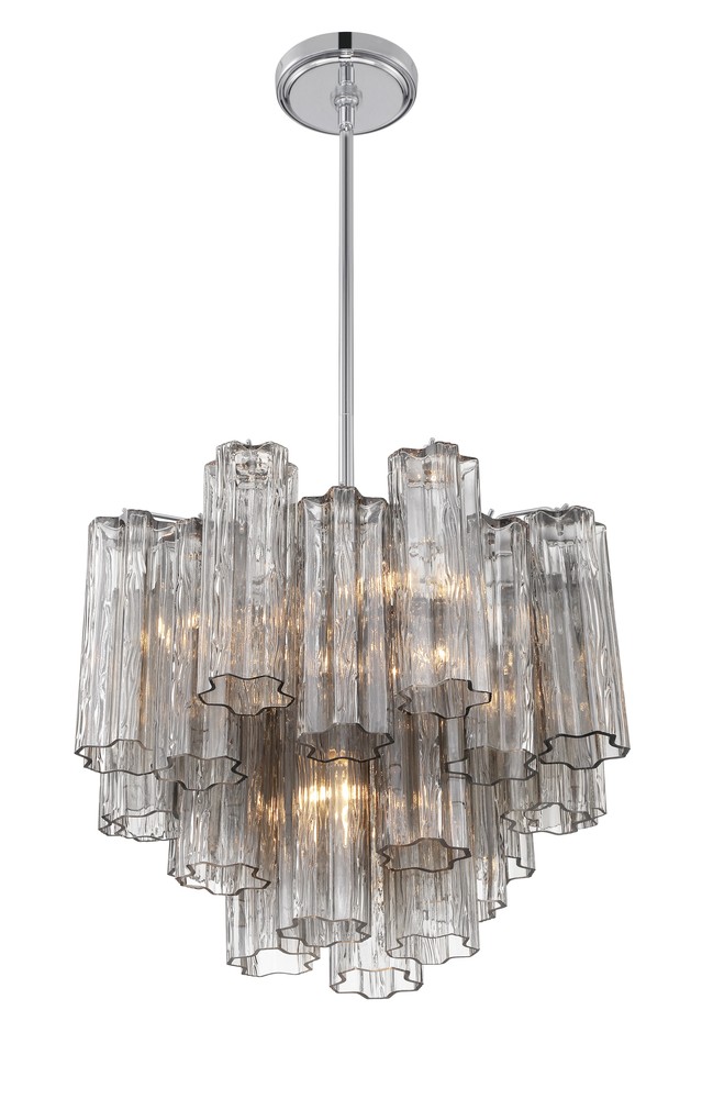 The captivating Addis Lighting Collection is a modern-day interpretation of the iconic mid-century Tronchi chandelier. Inspired by its predecessor's sleek lines and geometric shapes, the Addis features a polished Chrome or Aged Brass metal frame that exudes sophistication and style. Its unique design showcases transparent tiers of textured Tronchi glass tubes, forming a mesmerizing 5-point rounded star shape. Choose from a range of glass colors, including clear, amber, smoke, and white, or the stunning Autumn option, which features a captivating multicolor disposition of amber, clear, and smoke Tronchi glass. The Addis Lighting Collection offers various sizes and finishes, allowing you to find the perfect fit for your space while adding a touch of timeless elegance.