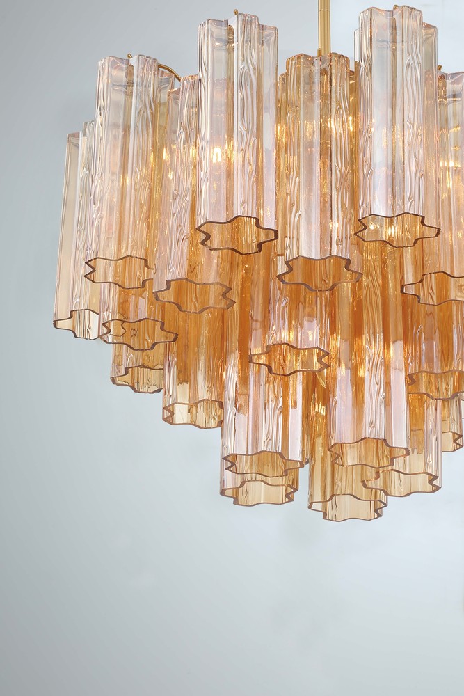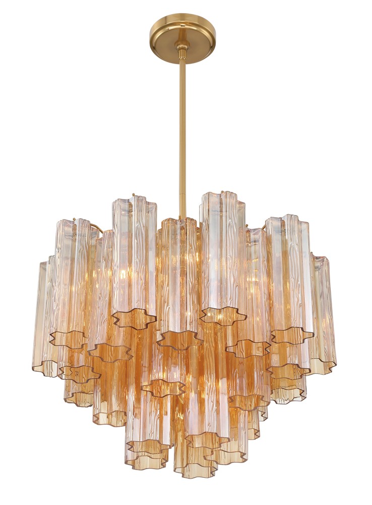The captivating Addis Lighting Collection is a modern-day interpretation of the iconic mid-century Tronchi chandelier. Inspired by its predecessor's sleek lines and geometric shapes, the Addis features a polished Chrome or Aged Brass metal frame that exudes sophistication and style. Its unique design showcases transparent tiers of textured Tronchi glass tubes, forming a mesmerizing 5-point rounded star shape. Choose from a range of glass colors, including clear, amber, smoke, and white, or the stunning Autumn option, which features a captivating multicolor disposition of amber, clear, and smoke Tronchi glass. The Addis Lighting Collection offers various sizes and finishes, allowing you to find the perfect fit for your space while adding a touch of timeless elegance.