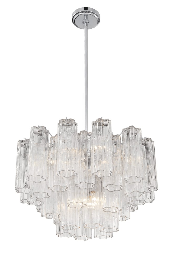 The captivating Addis Lighting Collection is a modern-day interpretation of the iconic mid-century Tronchi chandelier. Inspired by its predecessor's sleek lines and geometric shapes, the Addis features a polished Chrome or Aged Brass metal frame that exudes sophistication and style. Its unique design showcases transparent tiers of textured Tronchi glass tubes, forming a mesmerizing 5-point rounded star shape. Choose from a range of glass colors, including clear, amber, smoke, and white, or the stunning Autumn option, which features a captivating multicolor disposition of amber, clear, and smoke Tronchi glass. The Addis Lighting Collection offers various sizes and finishes, allowing you to find the perfect fit for your space while adding a touch of timeless elegance.