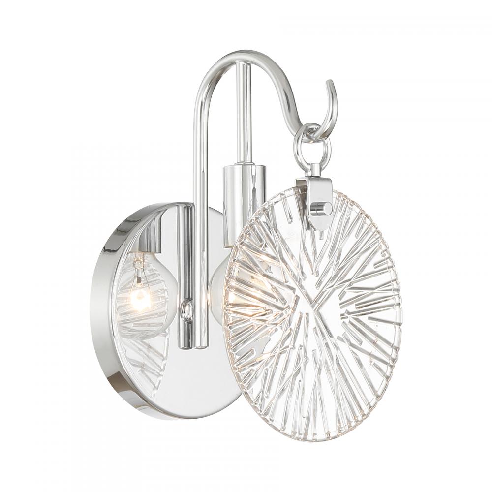 It is often said that lighting is the jewelry of the home. With its fun hook-style arm that holds a flat, round, starburst clear glass shade, the Savoy House Addison 1-light sconce is a great example of this saying. The backplate is finished in Chrome and mimics the shape of the glass shade. Addison is 9" in height, 5.75" in width and extends 5.5" from the wall. Uses one candelabra size bulb of up to 60 watts. The bulb is not included. This sconce is damp area rated and must be installed as shown.