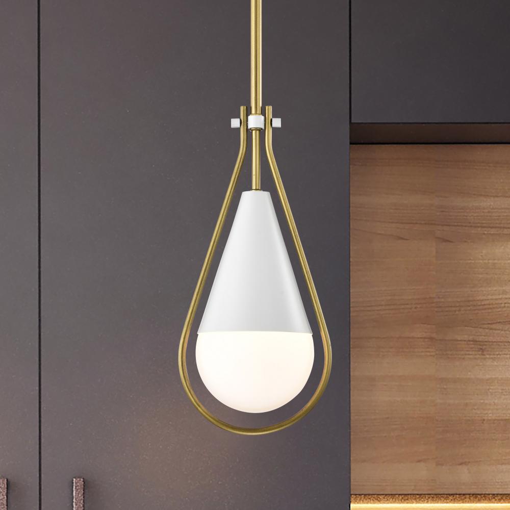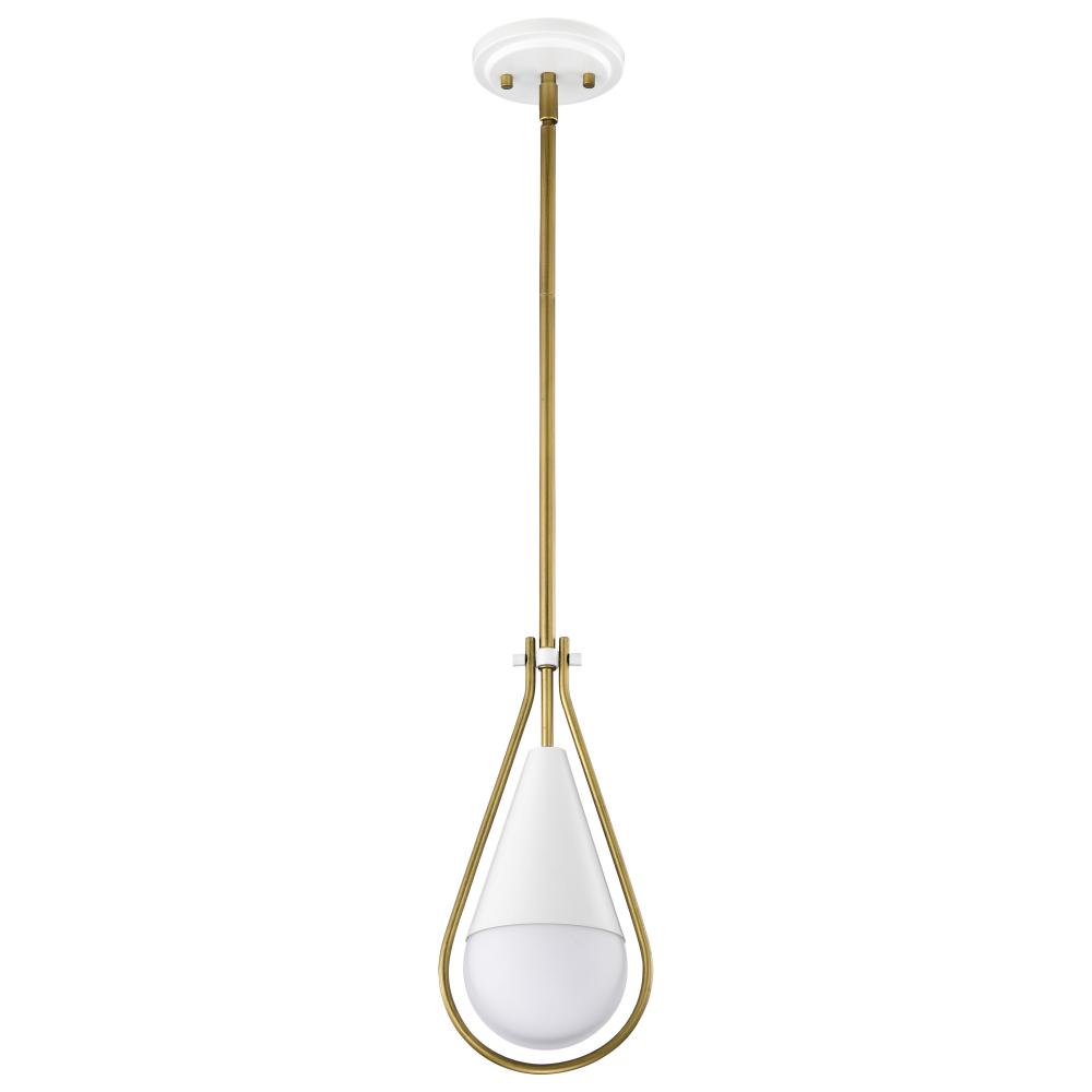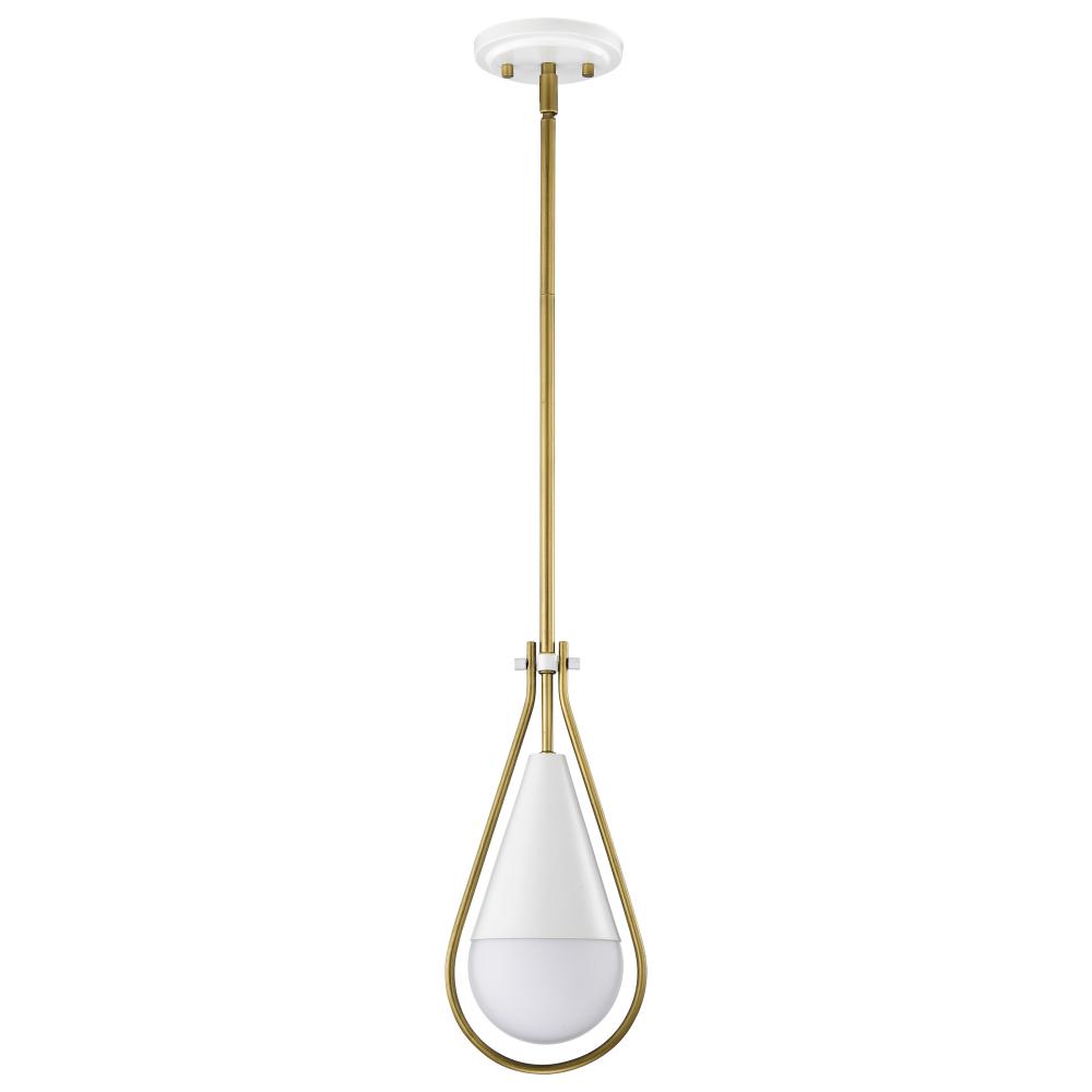 A modern collection with a twist, the Admiral 60-7922 small pendant features a dual finish, unique design, and a fashionable statement for home luminaires. A suspended tear-dropped shape is comprised of matte white with natural brass elements encompassing