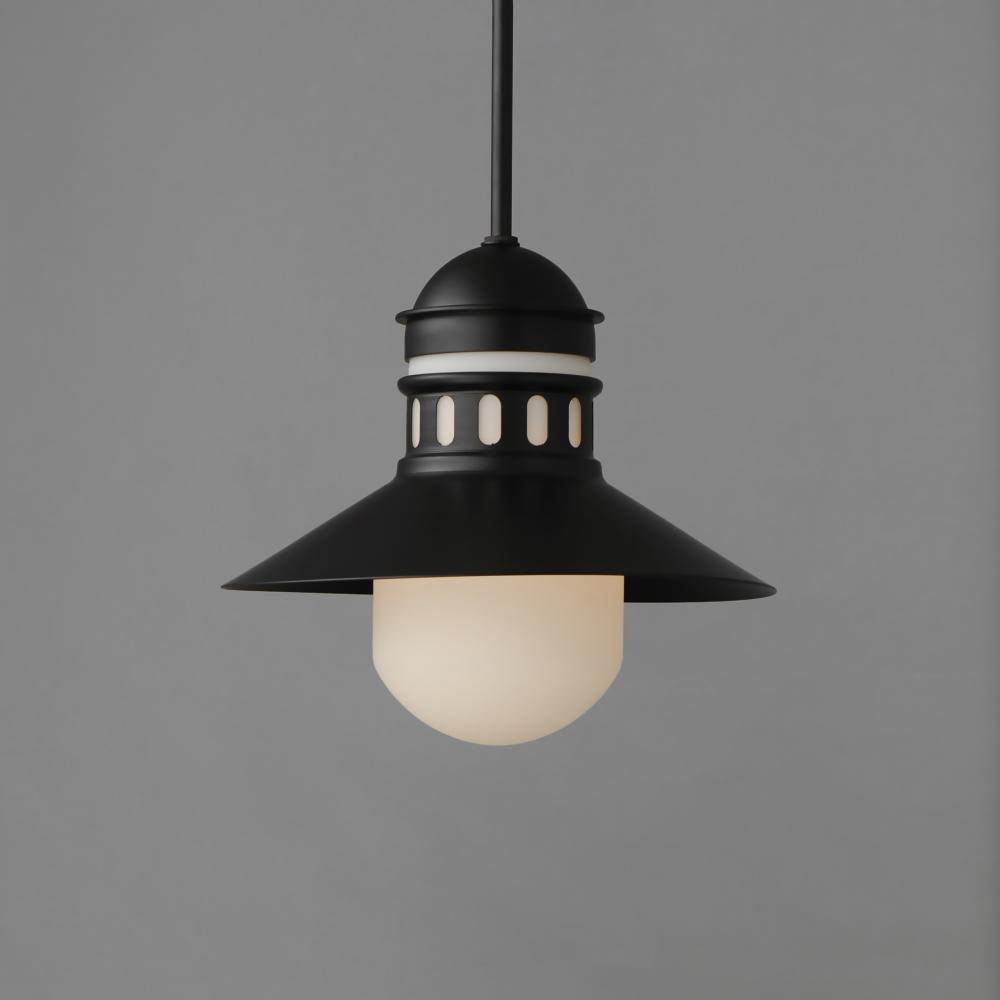 Coastally inspired, the wide brimmed aluminum spun shade on this series of outdoor rated sconces, pendants, and flush mounts features a tiered shade design. The ringed separation features a filigree of oval cut outs, whereby a single lamp illuminates the S