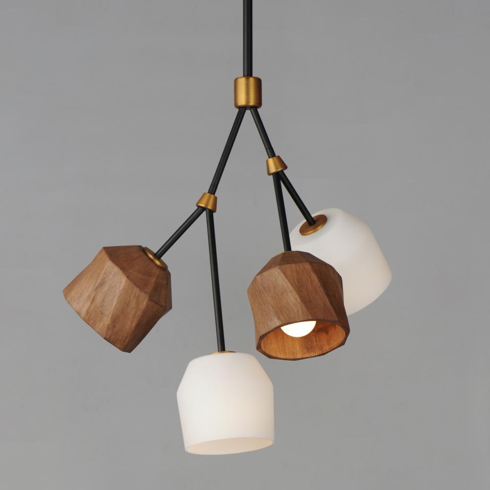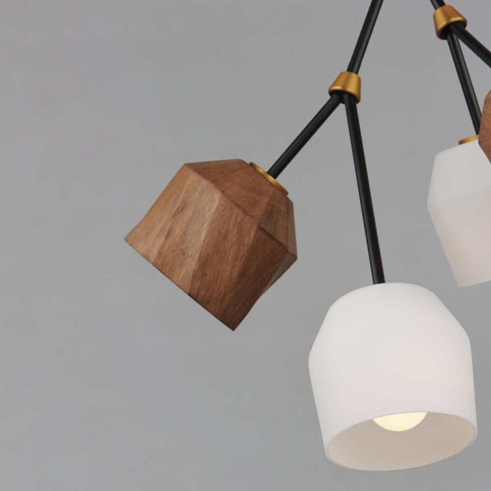 This stylish modern chandelier combines solid wood shades with warm bronze and brass tones for a striking, transitional look. Featuring arms akimbo, the design pairs walnut-stained oak with Satin White glass shades, offering a sophisticated blend of materi