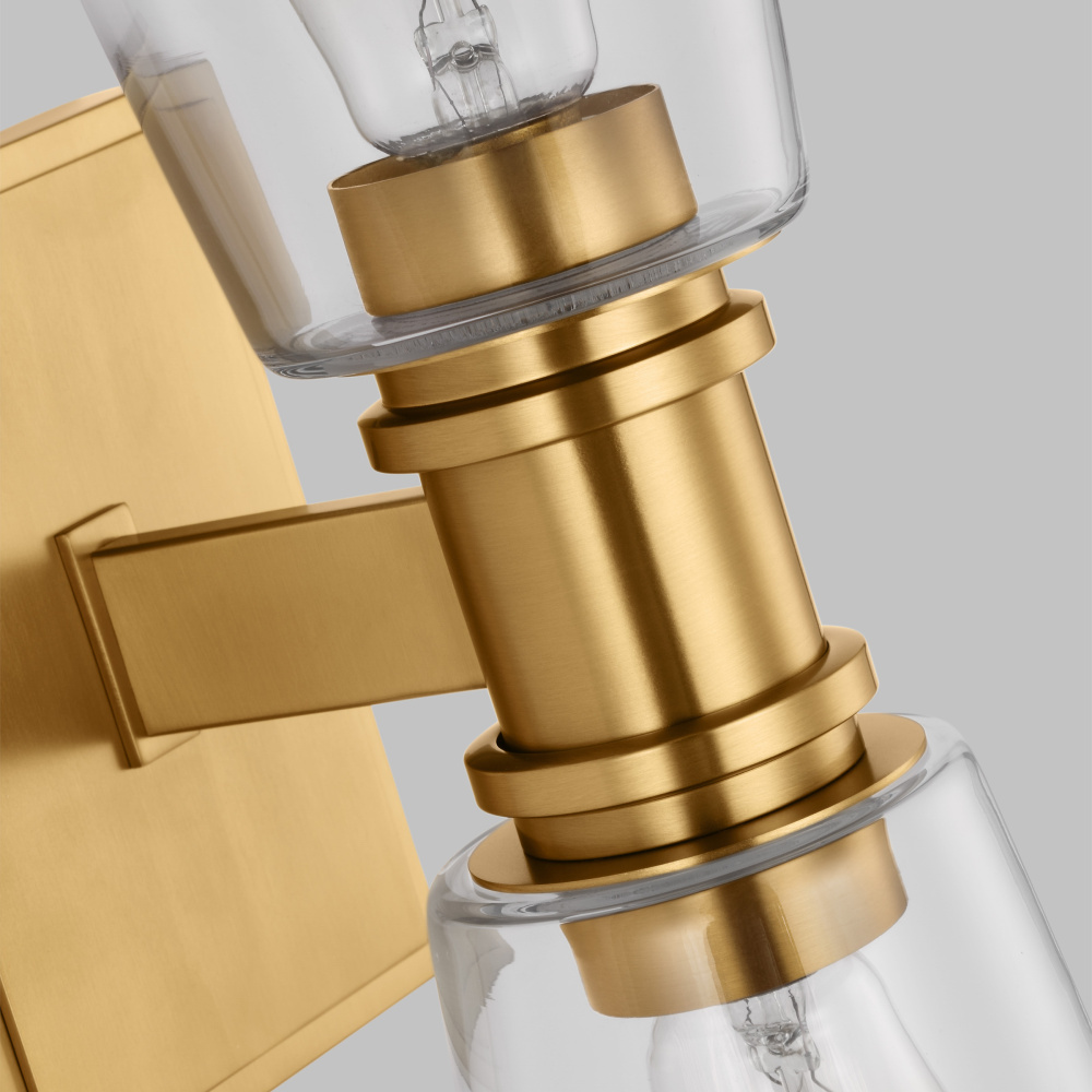 Designed by Chapman & Myers, the Alessa two light wall sconce in polished nickel is a Simple glass bathroom collection with rectangular metal arms and tapered clear glass shades. The conical clear glass shades replicate and frame the shape of the inner filament bulb. Each shade is supported by a rectangular metal arm and is capped with a thin metal rim.
