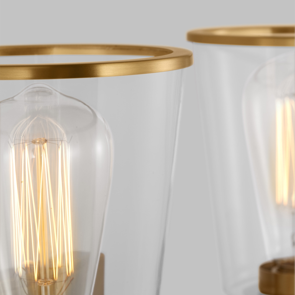 Designed by Chapman & Myers, the Alessa two light wall sconce in polished nickel is a Simple glass bathroom collection with rectangular metal arms and tapered clear glass shades. The conical clear glass shades replicate and frame the shape of the inner filament bulb. Each shade is supported by a rectangular metal arm and is capped with a thin metal rim.