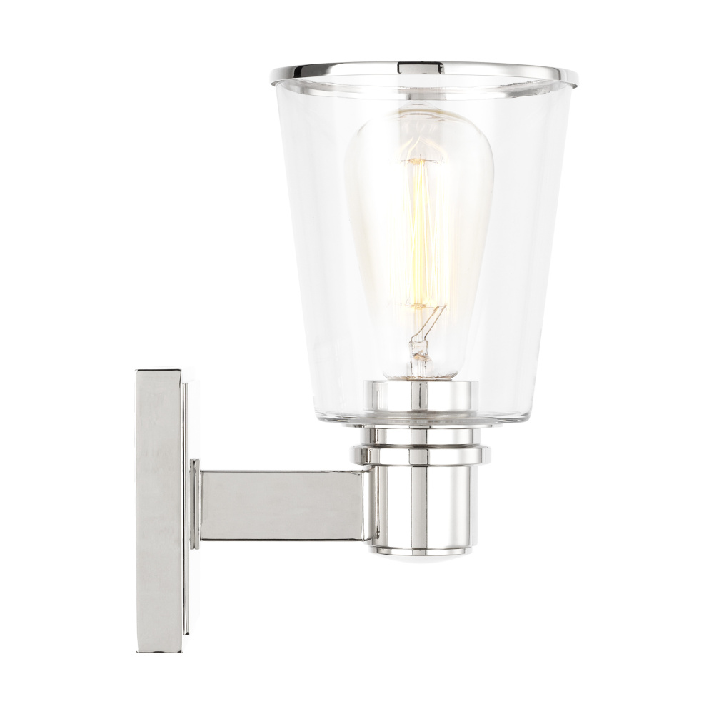 Designed by Chapman & Myers, the Alessa one light wall sconce in polished nickel is a Simple glass bathroom collection with rectangular metal arms and tapered clear glass shades. The conical clear glass shades replicate and frame the shape of the inner filament bulb. Each shade is supported by a rectangular metal arm and is capped with a thin metal rim.