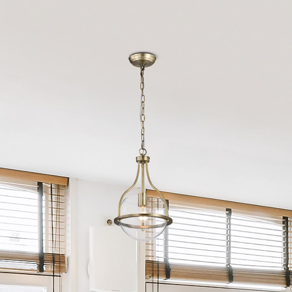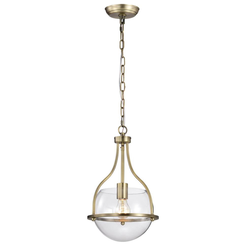 Elegant, transitional allure completes the Amado 60-7815 small pendant with it's unassuming style. The glow of vintage brass creates a warm ambiance and the clear glass bowl delicately showcases the light and is encompassed in graceful lines to exude c