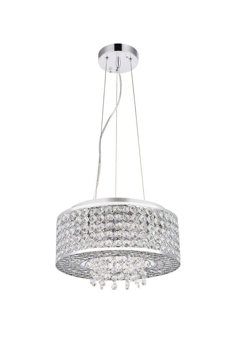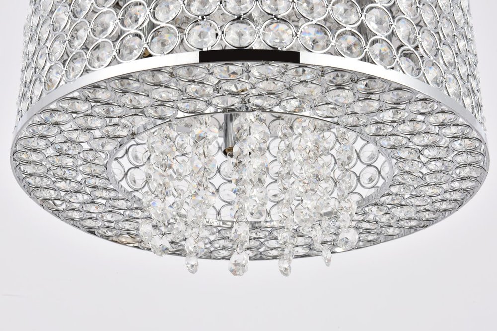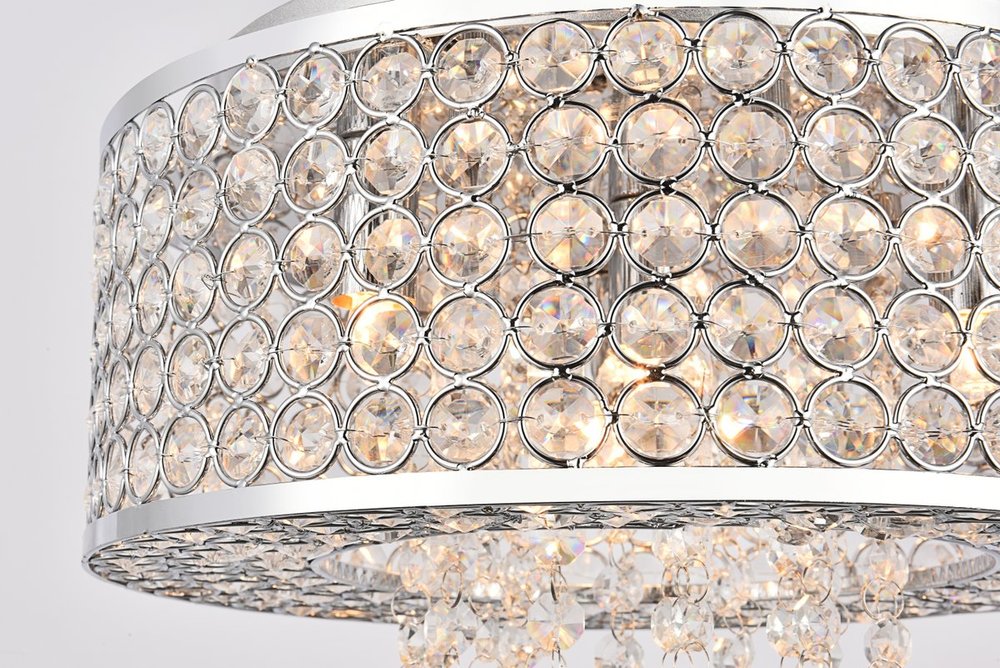 Like a brilliant shining star, the Amelie collection of hanging fixtures emits dazzling light from a bejeweled circular band, accented with gleaming strands of royal-cut crystals pouring through the open center. This chrome-finished ring surrounds four to 10 lights (not included) that highlight the intricate pattern of miniature circles that embellish the sides and bottom of the frame. in natural light, or with electricity, this sparkling hanging light would become a stunning showpiece for your space.