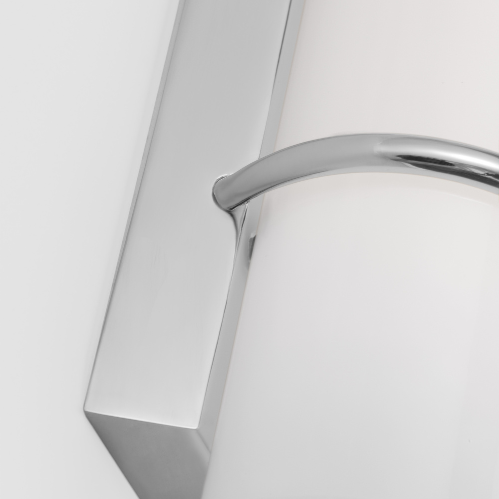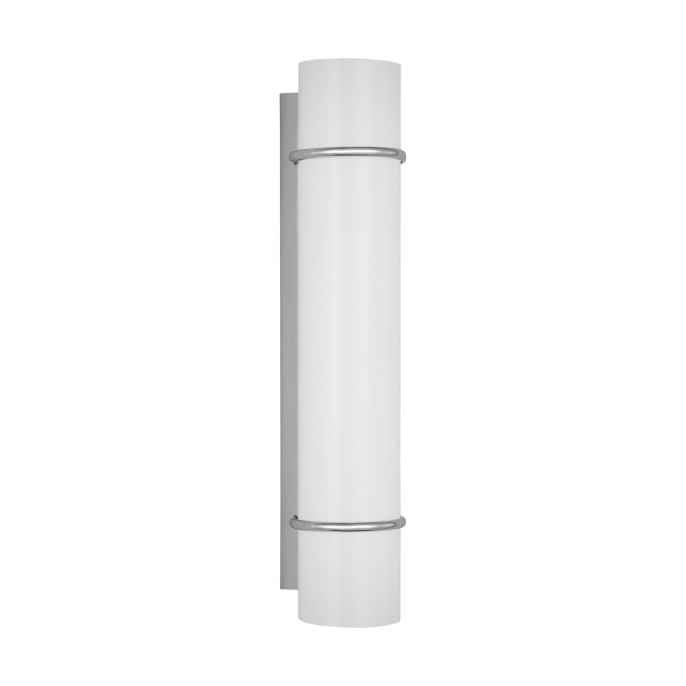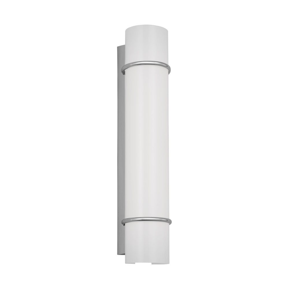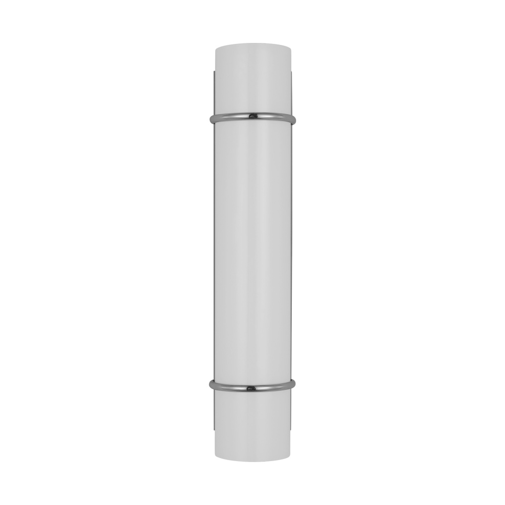 The Amelie Integrated LED vanity series by Chapman & Myers is a simplified cylindrical linear bath light with two metal rings inspired by a vintage cuff bracelet. Each sconce has a cylindrical glass shade accented by two metal rings on either end of the sconce and a metal back plate. Amelie is illuminated with custom-led panels to provide an even glow through the white glass shades. Available in three sizes and three finish options. Dimmable Integrated LED lamping with Damp location rating.