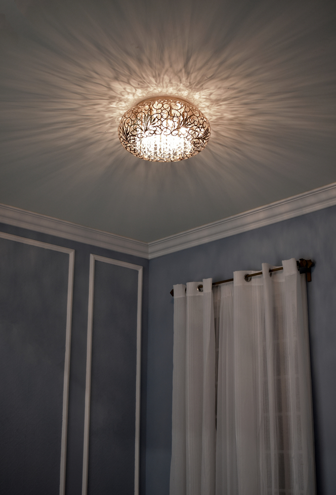 The Arabesque collection's intricate patterns are formed in metal and finished in Golden Silver. Strands of crystal beads add sparkle as they shimmer through the Xenon lamps. Unique oval-shaped pendants add a touch of class to any room.