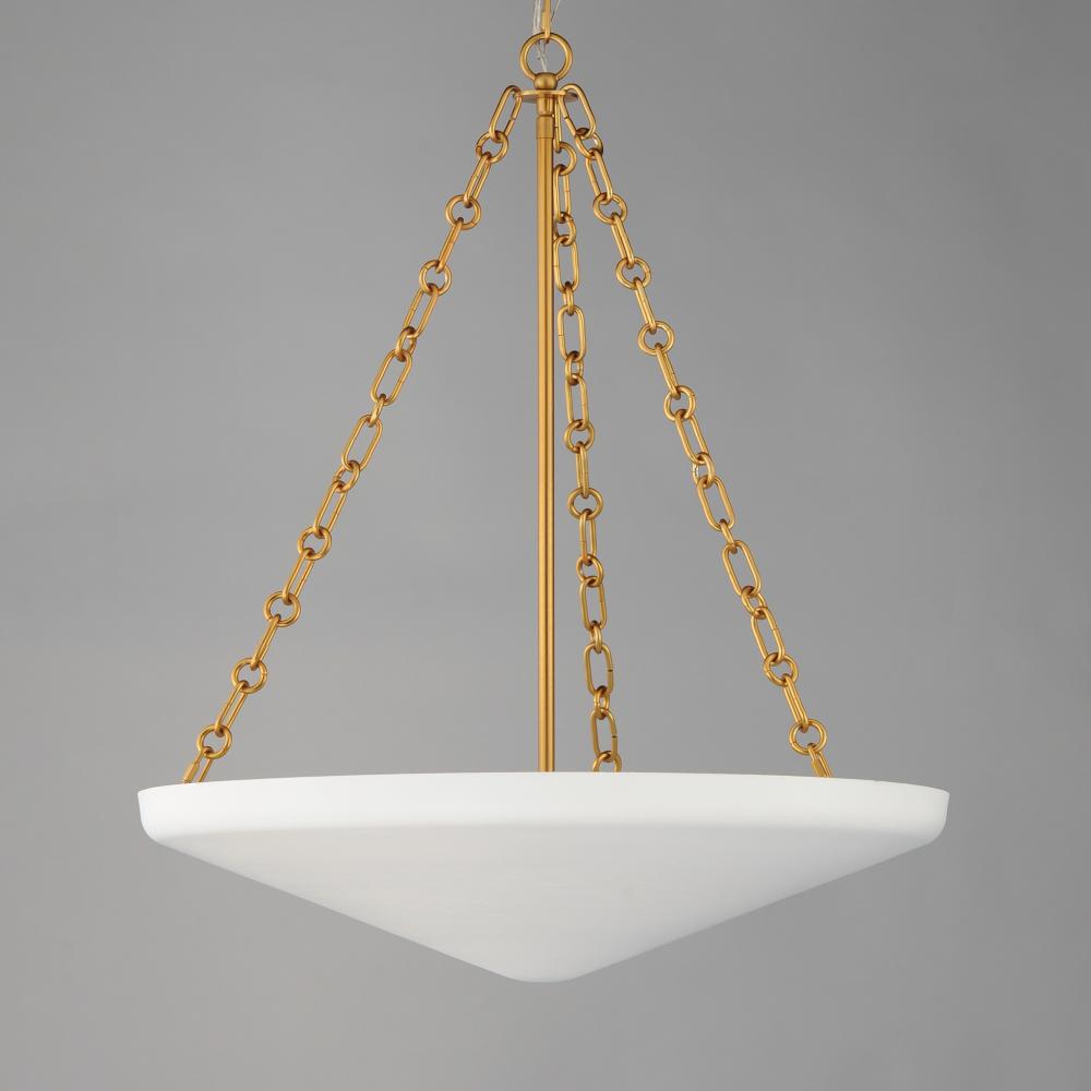 An inverted steel cone vessel painted in textured Plaster White gesso provides ambient lighting with classical styling. The stylized ring and oval chain links in Natural Aged Brass compliment the overall design. Available in two sizes of pendants and flush