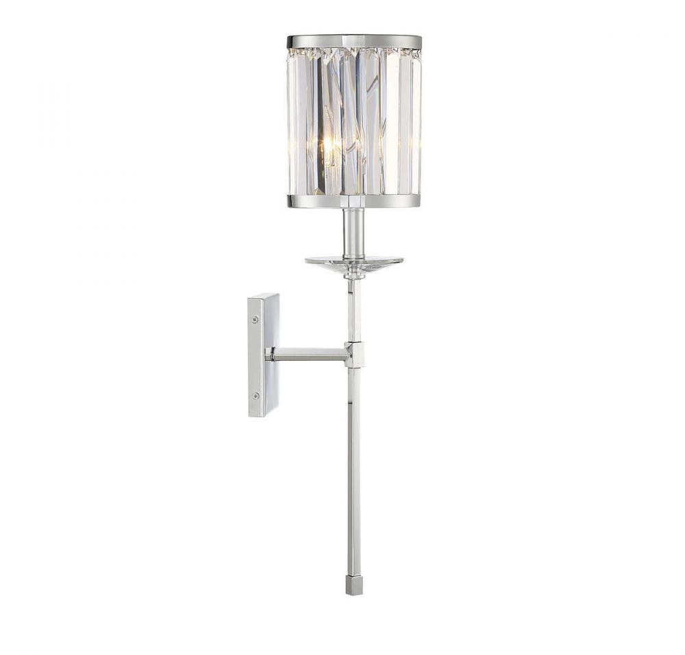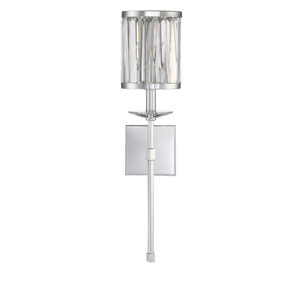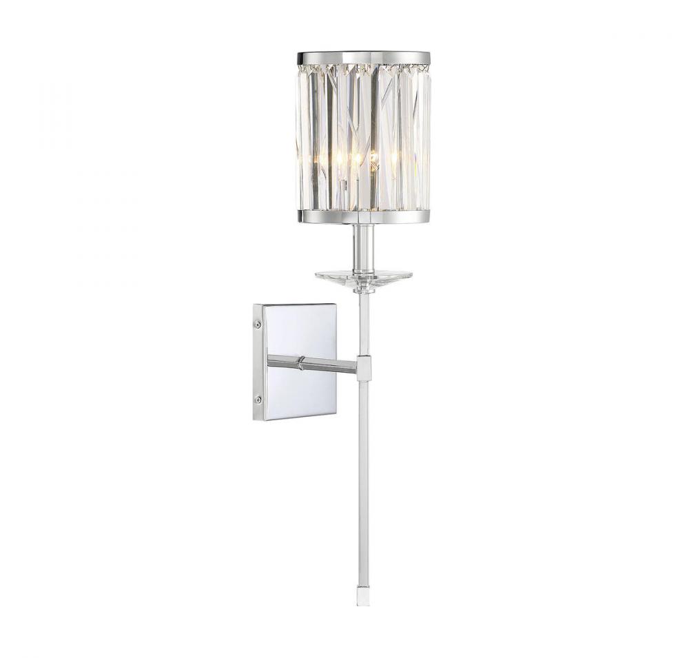 In the Savoy House Ashbourne, contemporary styling meets traditional materials for a wall sconce that’s right at home in your transitional or traditional decor. The light arm, wall plate and rims of the frame have a rich polished chrome finish. The frame is lined with beautiful rectangular clear crystals and there’s a decorative crystal just below the lamp too. One 60W candelabra size bulb within provides lovely illumination filtered through the crystals. The Ashbourne sconce is 6.5" wide, 26" high and extends 8" from the wall, making it a perfect size for your dining area, living room, entryway, great room, bedroom, bathroom, hallway, office, family room or stairway.