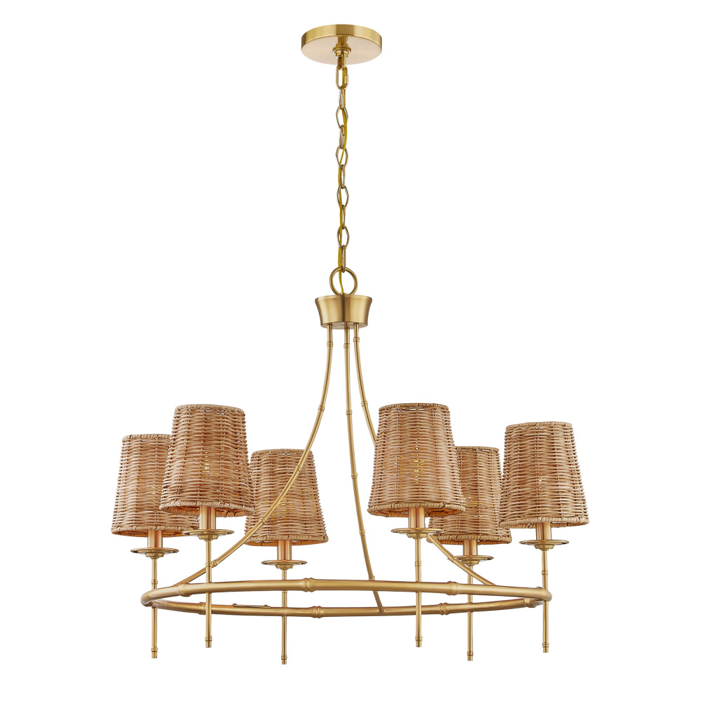Find fabulous organic allure with the Savoy House Ashbury 6-light chandelier! Bamboo-inspired detailing on the arms and center column matches up nicely with the textured rattan shades to bring a relaxed natural style to any space. The Warm Brass finish adds a glamorous touch. Ashbury is 30" in height and 30" in width. It uses six candelabra size bulbs of up to 60 watts per bulb. Bulbs not included. Comes with 120" of chain and 144" of cord.