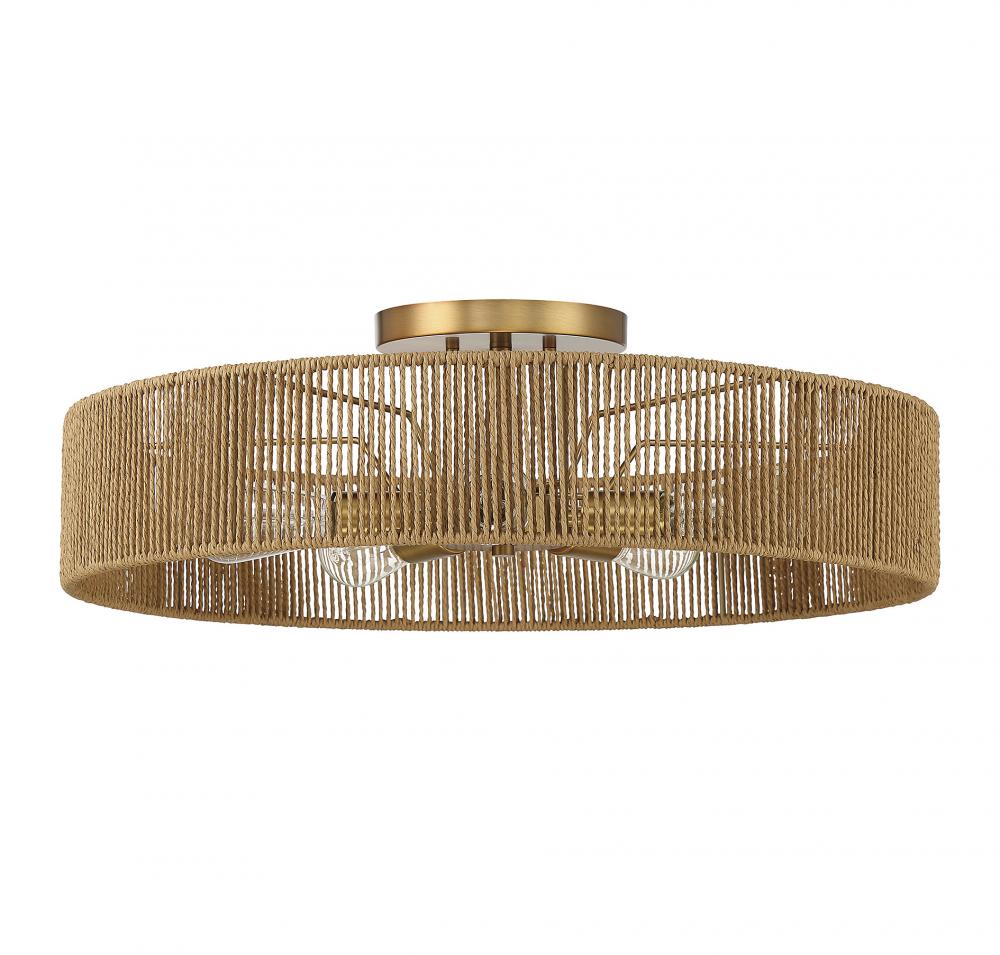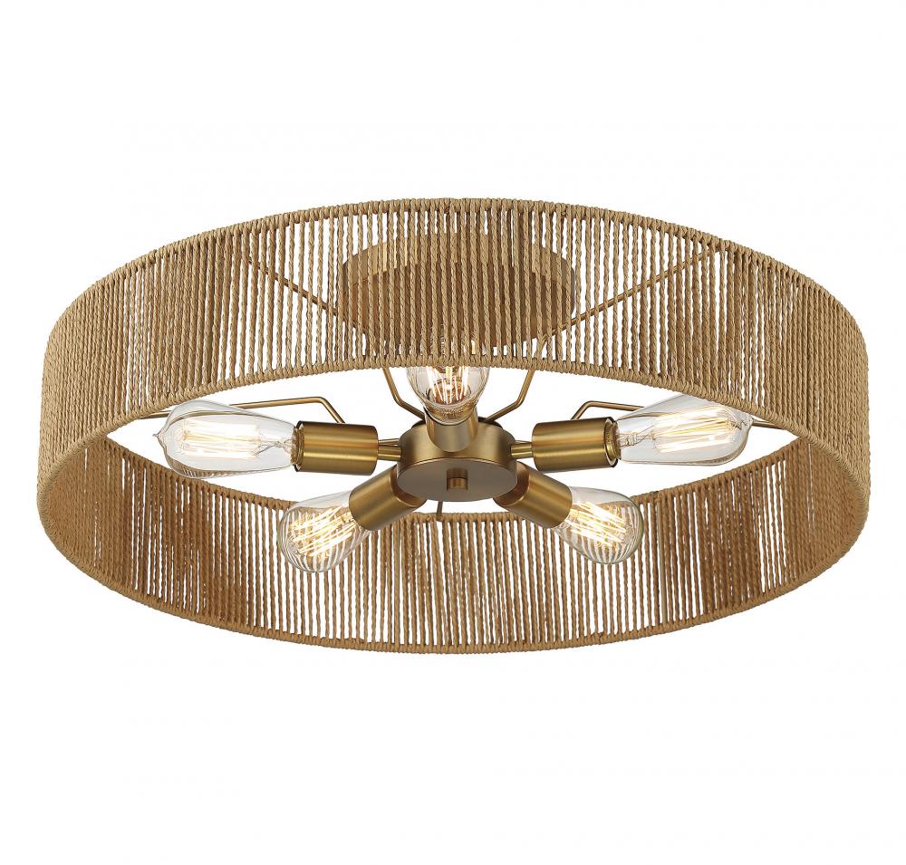 Featuring a slim, wide shade woven with rope, the Savoy House Ashe 5-light ceiling light is an ideal way to welcome relaxed organic style into your home. A warm brass finish makes for a harmonious pairing with the rope, too. Ashe is 8" in height and 24" in width. It uses five standard size bulbs of up to 60 watts per bulb.