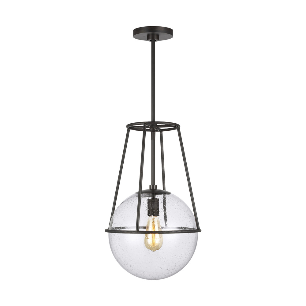 The Atlas one light indoor pendant in aged iron exudes touches of mid-century modern style with rustic undertones. A hand-forged Aged Iron finish pairs with a hand-blown Clear Seeded Glass globe shade to complete this design that's sure to make a statement. The Aged Iron finish is considered a living finish and will develop an increasingly beautiful patina over time.