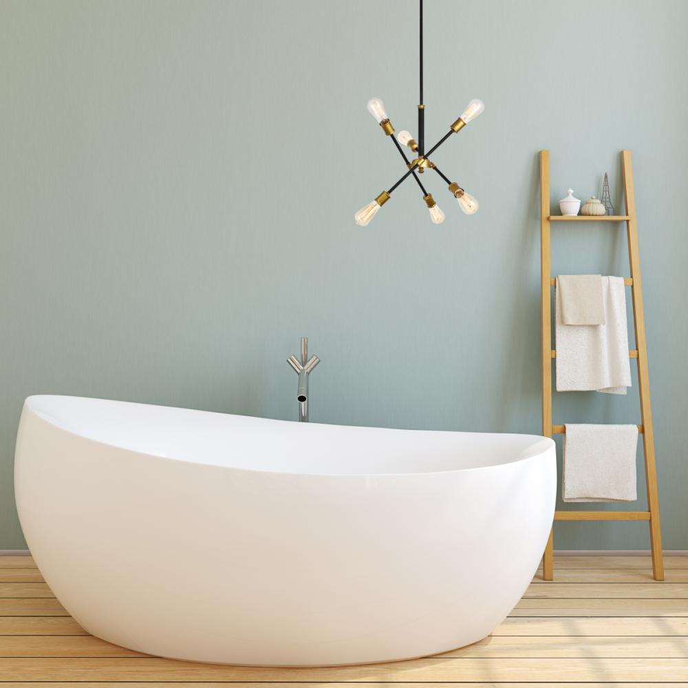 Modern sophistication with a jaunty presentation. This Axel pendant features three adjustable crossing arms mounted on a central rod to direct light in any direction. A total of six light sources (bulbs not included) in a compact design offers functional beauty in smaller spaces. The absence of shades says industrial; the design says penthouse. The smooth steel hardware is finished in austere black with soft bronze sockets and canopy, adding a bit of tradition. Stylish and cutting-edge without being too eccentric.