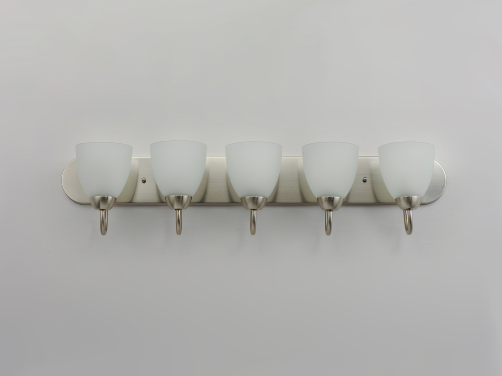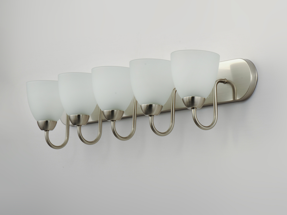 This transitional design works in any style home. Full length oval backplates support simple bell-shaped, Frosted glass shades. Available in Satin Nickel, Matte Black, and Polished Chrome.