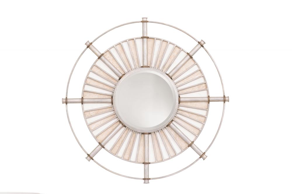 Hand Forged Wrought Iron in a Pear Silver finish with a beveled Mirror and Woodstone Accents.