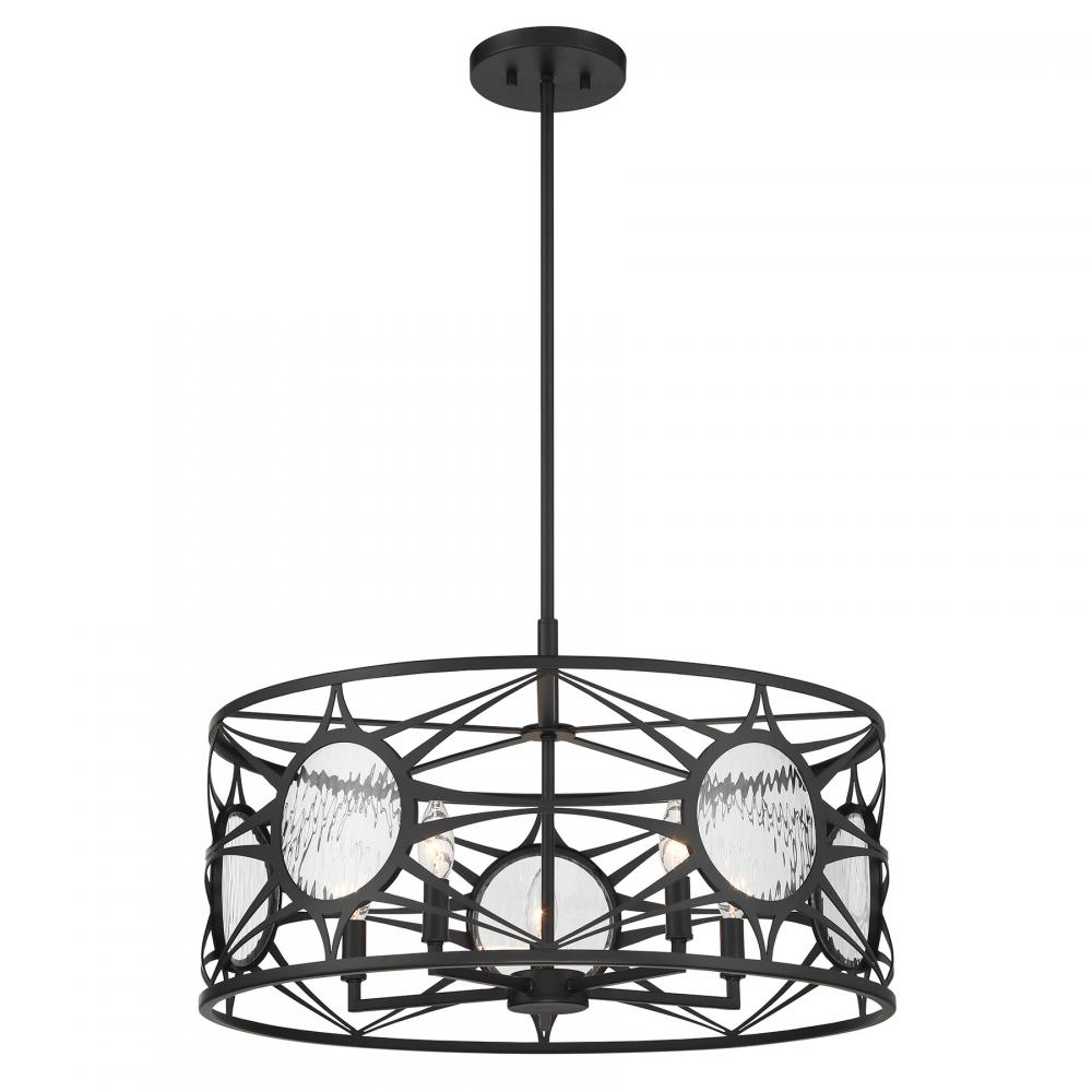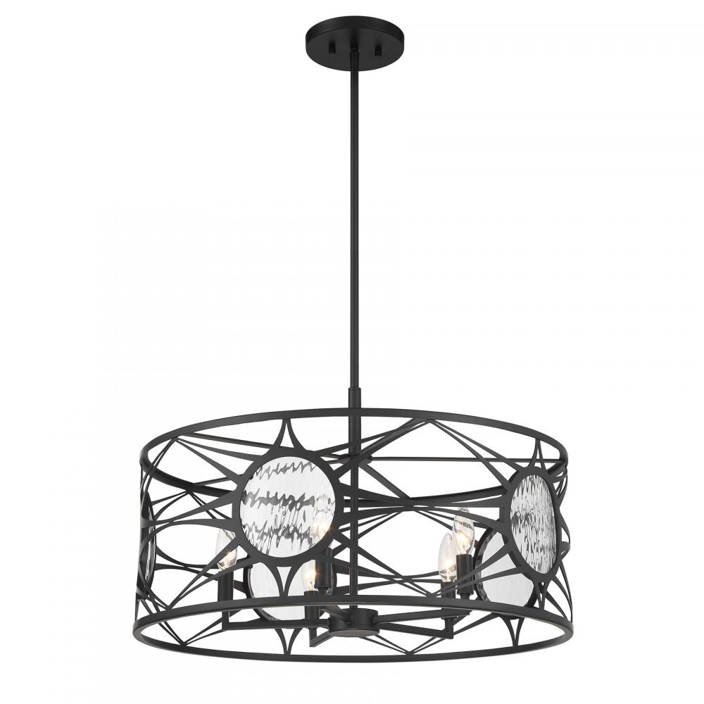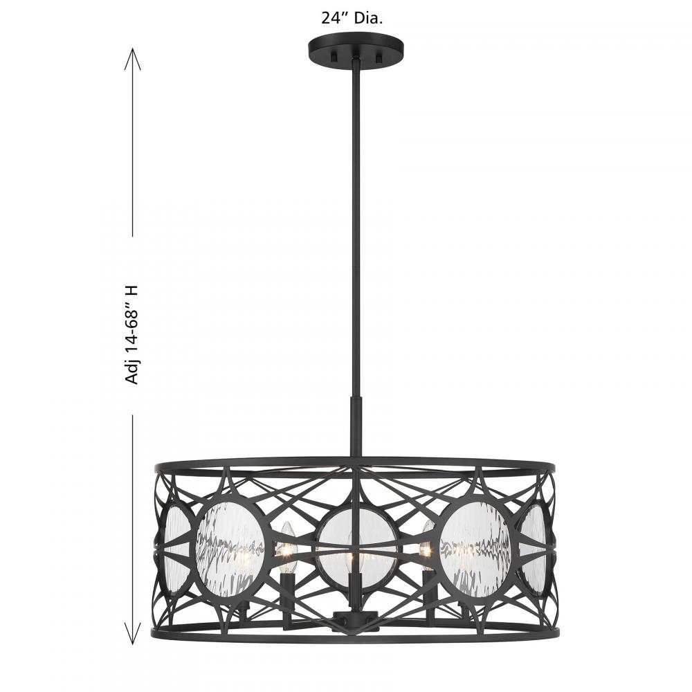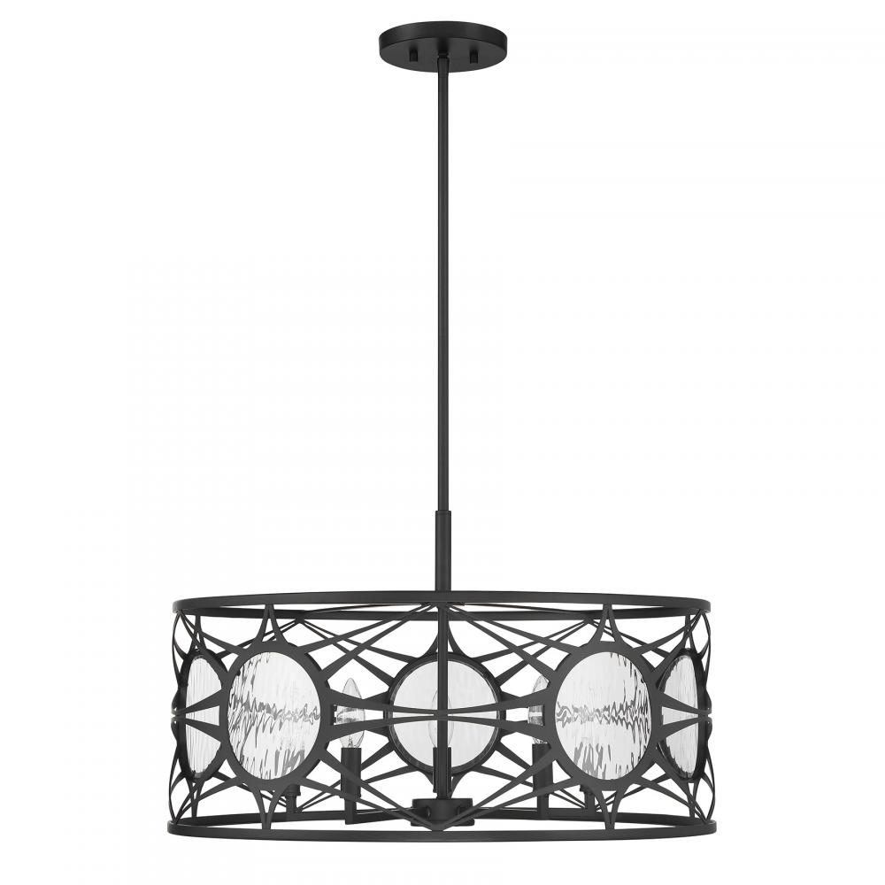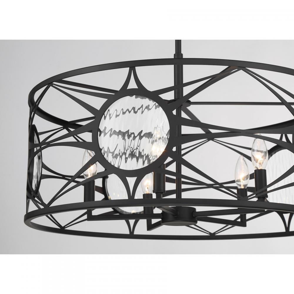 Let your sense of style shine through with the beautiful Balfour 5-light pendant from Savoy House! Its drum-shaped structure wears a Matte Black finish and is decorated with eye-catching starburst patterns that hold circular panes of clear water glass. Balfour is 24" in width and has an adjustable height ranging from 14" to 68". It uses five candelabra size bulbs of up to 60 watts per bulb. Bulbs not included. Comes with four 12" downrods and one 6" downrod. Can be converted for use as a ceiling semi-flush mount light.
