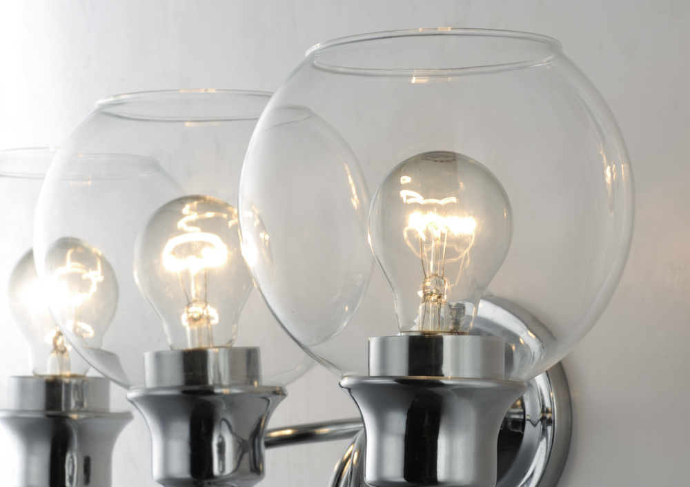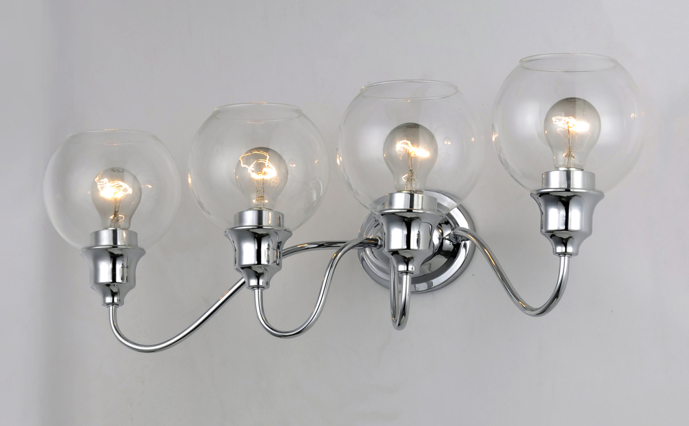 Curved arms support circular glass with an open bottom which can be installed facing up or down. Available in your choice of Polished Chrome with Clear glass or Satin Nickel with Satin White glass.