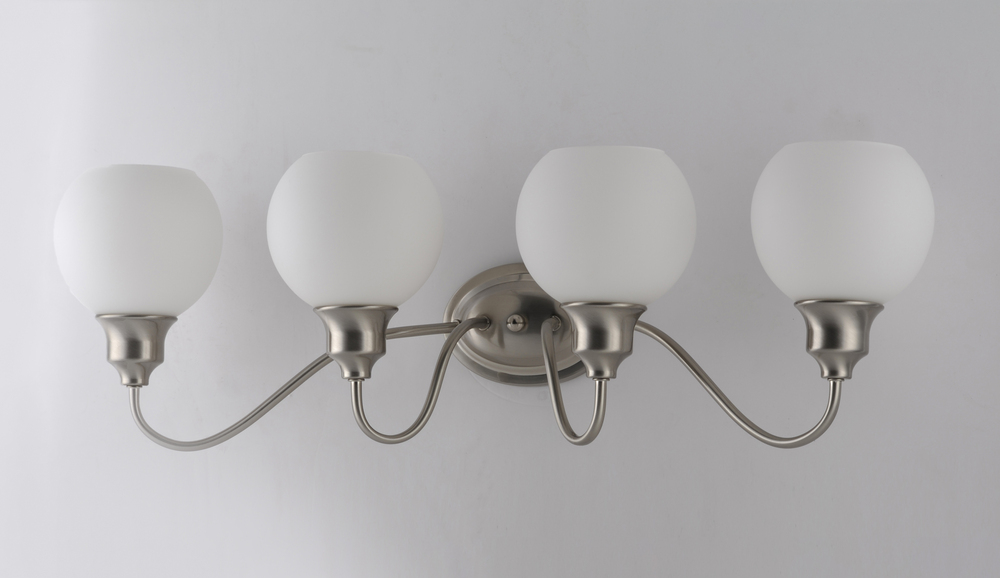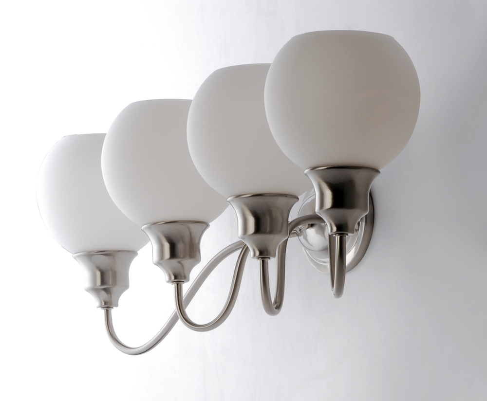 Curved arms support circular glass with an open bottom which can be installed facing up or down. Available in your choice of Polished Chrome with Clear glass or Satin Nickel with Satin White glass.