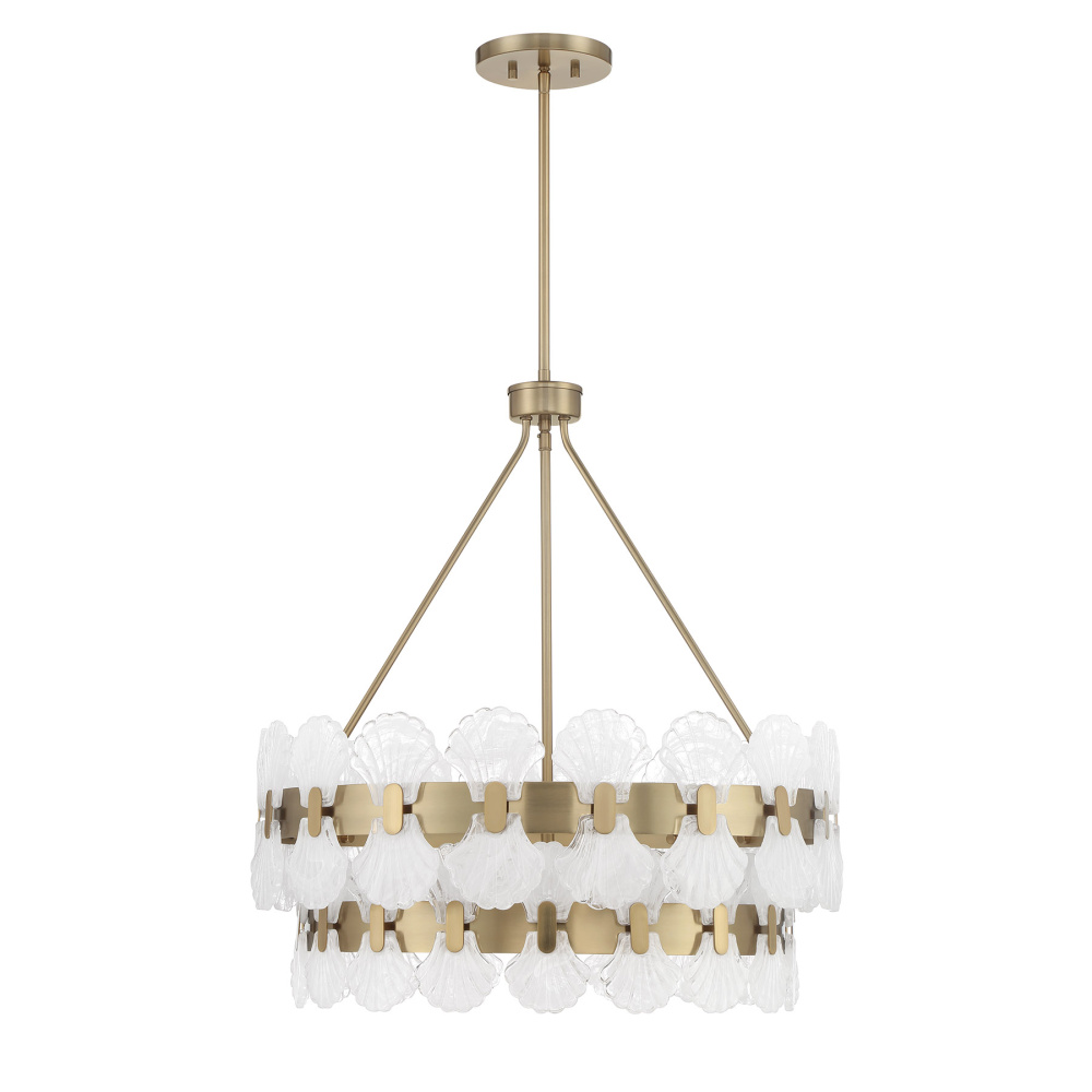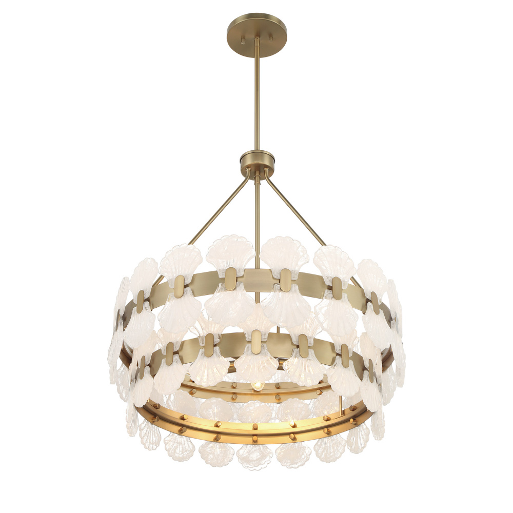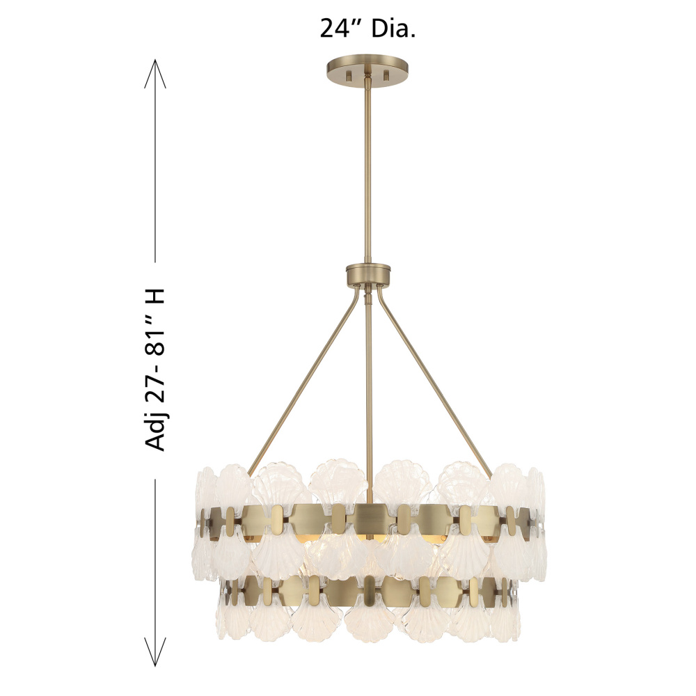 In the Bancroft 5-light chandelier from Savoy House, coastal charm is given a stylish upgrade! Its design is finished in fabulous Noble Brass and decorated with shell shapes crafted from mesmerizing strie glass. Bancroft is 27" in height and 24" in width. It uses five candelabra size bulbs of up to 60 watts per bulb. Bulbs not included. Comes with four 12" downrods and one 6" downrod.