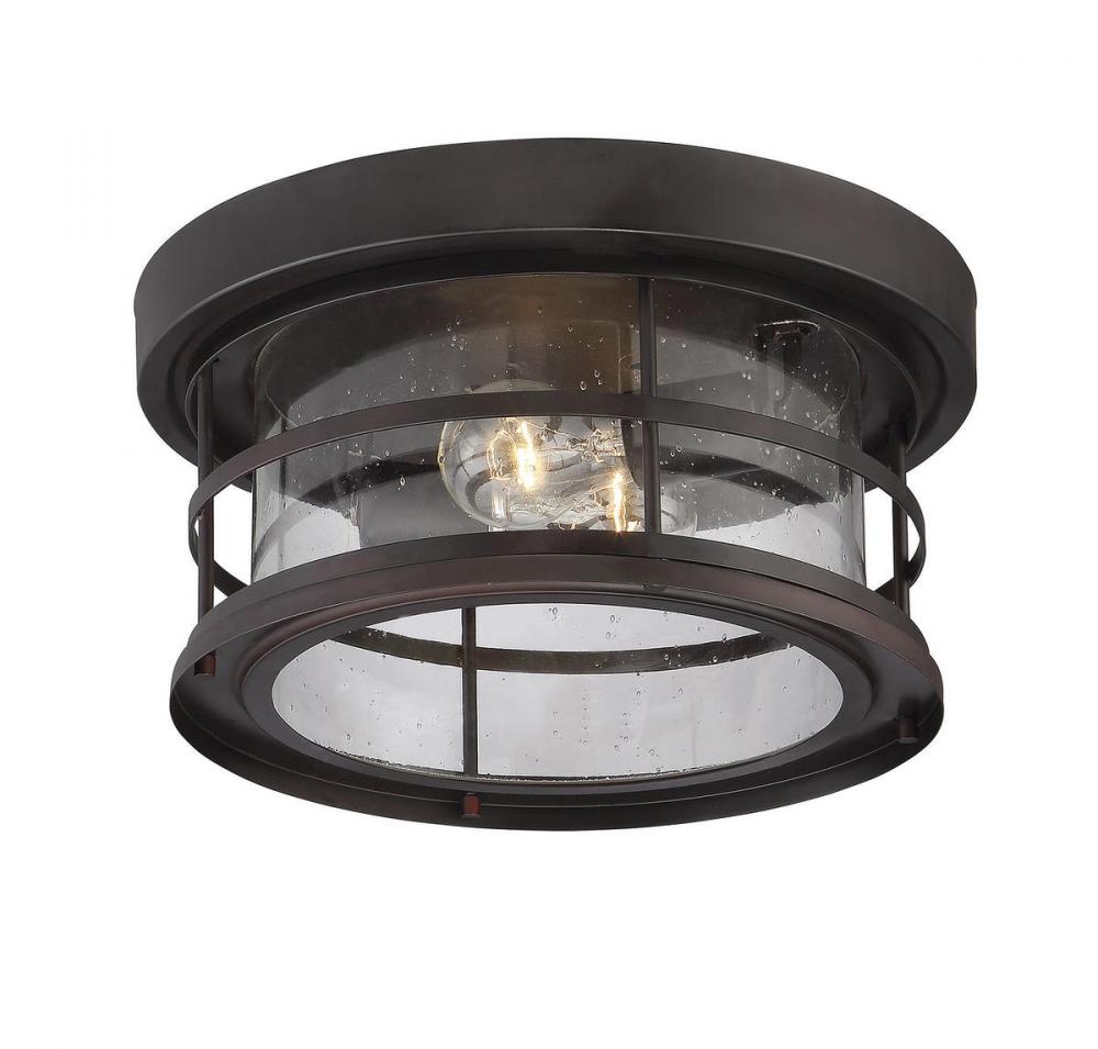 Light your outdoor spaces in retro-industrial style with the Savoy House Barrett 2-light flush mount. It has a sturdy, almost nautical aesthetic that looks great with many different architectural and decor styles. A round frame protects the glass shade and sports a streamlined grid design with a dark English bronze finish. The seeded glass shade has terrific texture and allows ample illumination from the 60W standard size bulbs. Measuring 13" wide and 6.75" high, this ceiling light works well alone or in groupings. Wet location rated, so it’s an ideal fixture to bring light and timeless style to your porch, patio, sunroom, pergola and other outdoor living areas.
