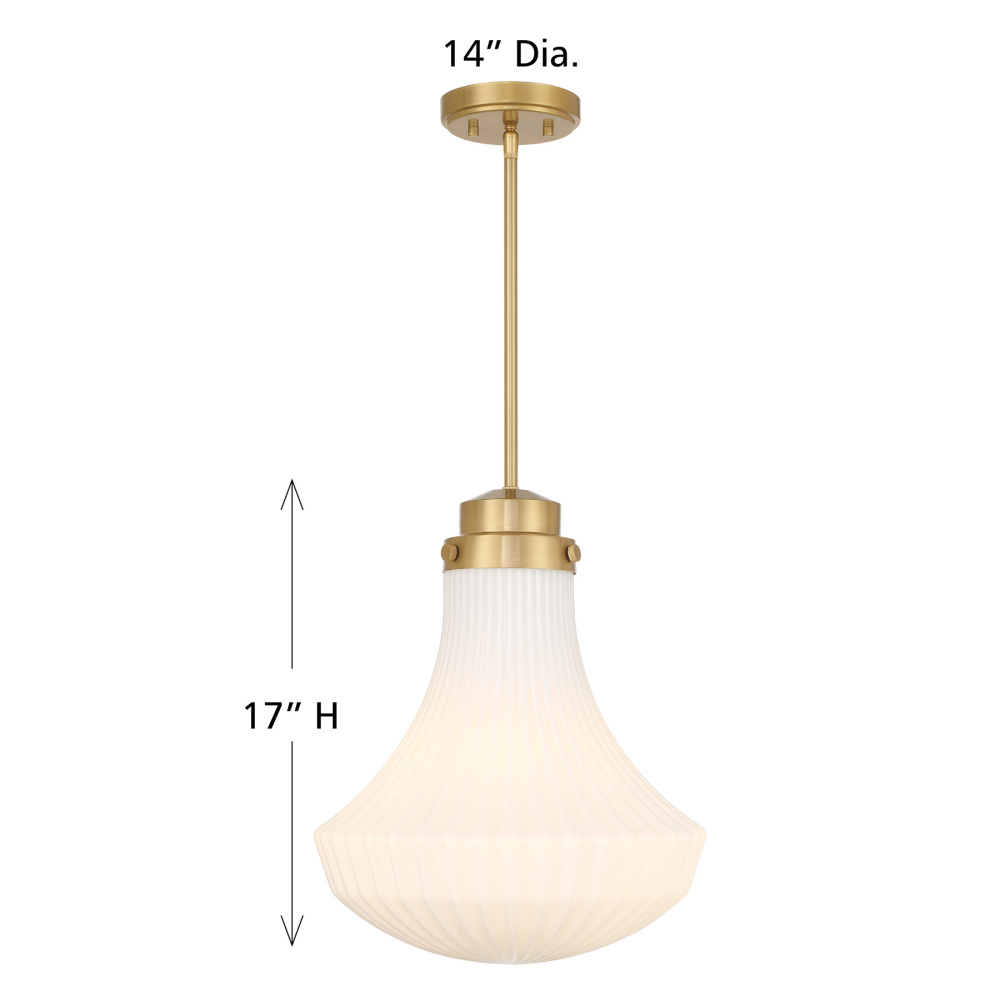 With a curving shade of white ribbed glass and a rich Warm Brass finish, the Savoy House Bartlet 1-light pendant will bring a touch of vintage charm to any space! Bartlet is 17" in height and 14" in width. Comes with four 12" downrods and one 6" downrod. It uses one standard size bulb of up to 60 watts. Bulb not included.