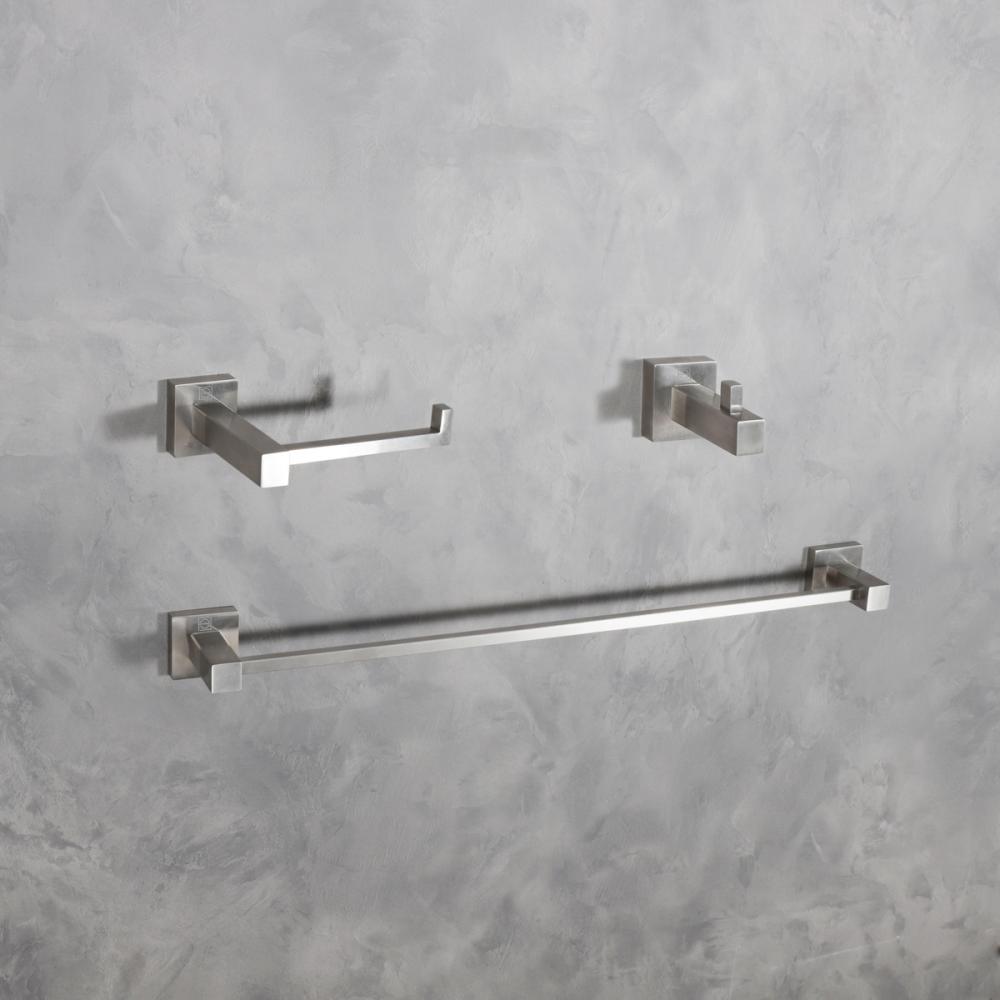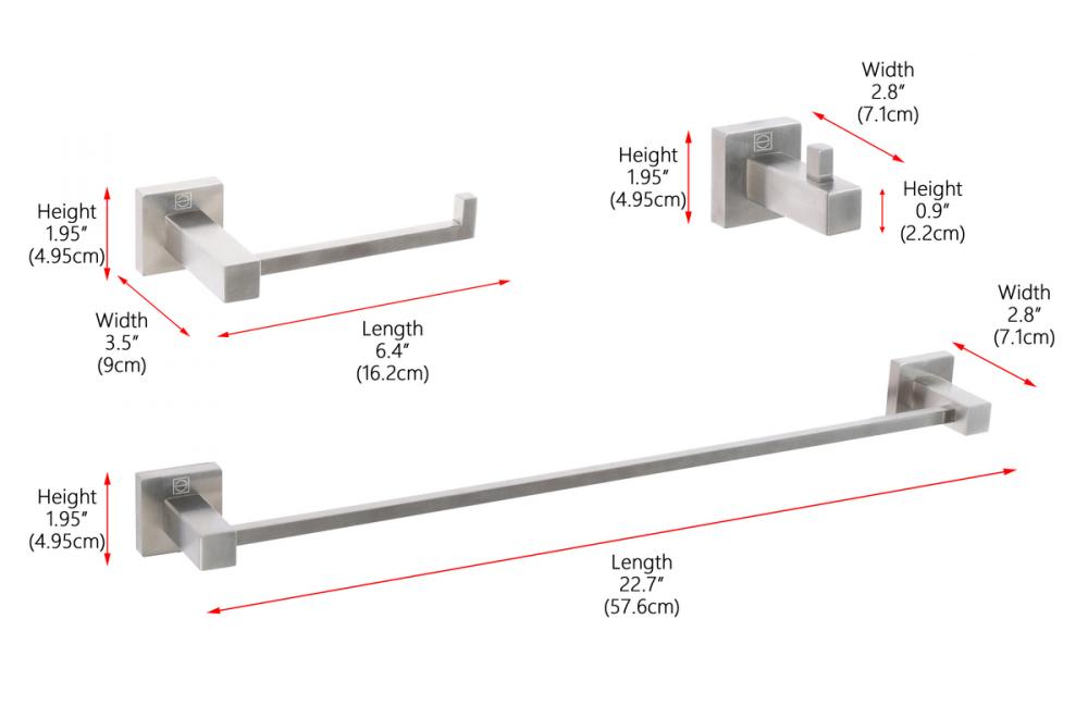 Our Bathroom Hardware Set is all you need to enhance your bathroom. It includes a generous 22.5" long towel bar, a practical 6.3" open-ended toilet paper holder, and a handy 2.83" towel/robe hook.