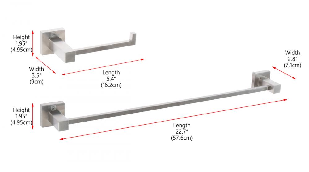 In this set, you'll find a 22.7" long towel bar and a 6.4" long toilet paper holder, encompassing all the necessary elements for your bathroom.