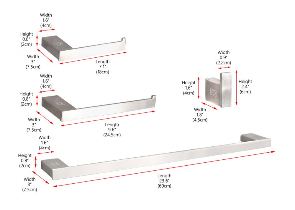 Our all-in-one bathroom hardware set includes a 23.6" long towel bar for bath towels, a 9.6" long towel bar for hand towels, a 7.1" long toilet paper holder, and a 2.4" towel/robe hook.