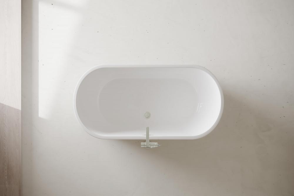 This freestanding bathtub boasts a timeless oval shape, designed to provide both aesthetic appeal and a comfortable bathing experience.