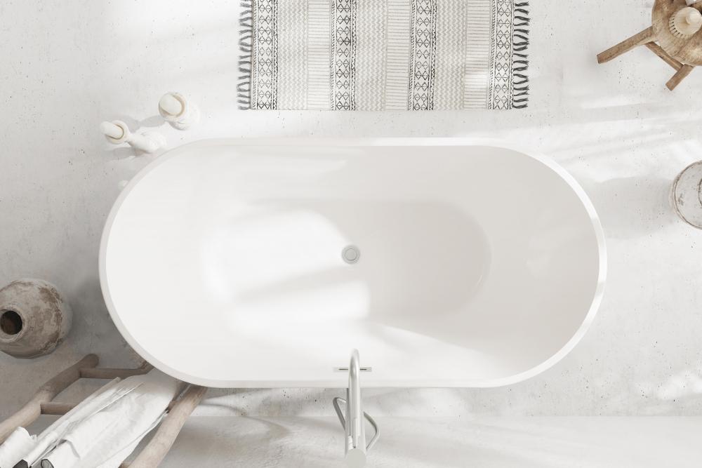 A double-ended freestanding bathtub offers symmetry and luxury. Both ends are gently sloped, allowing for comfortable reclining from either side.