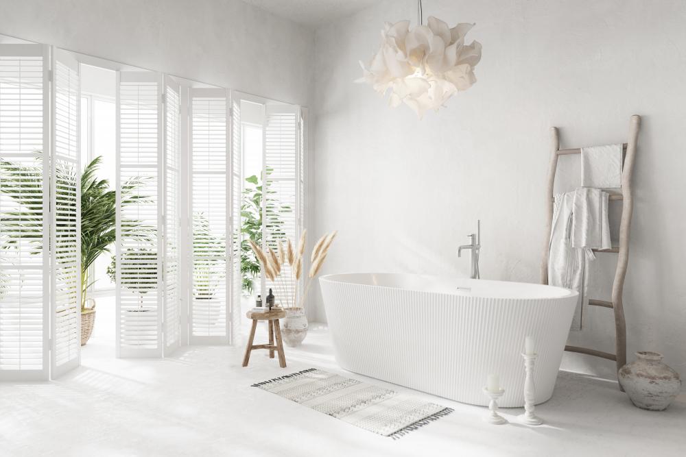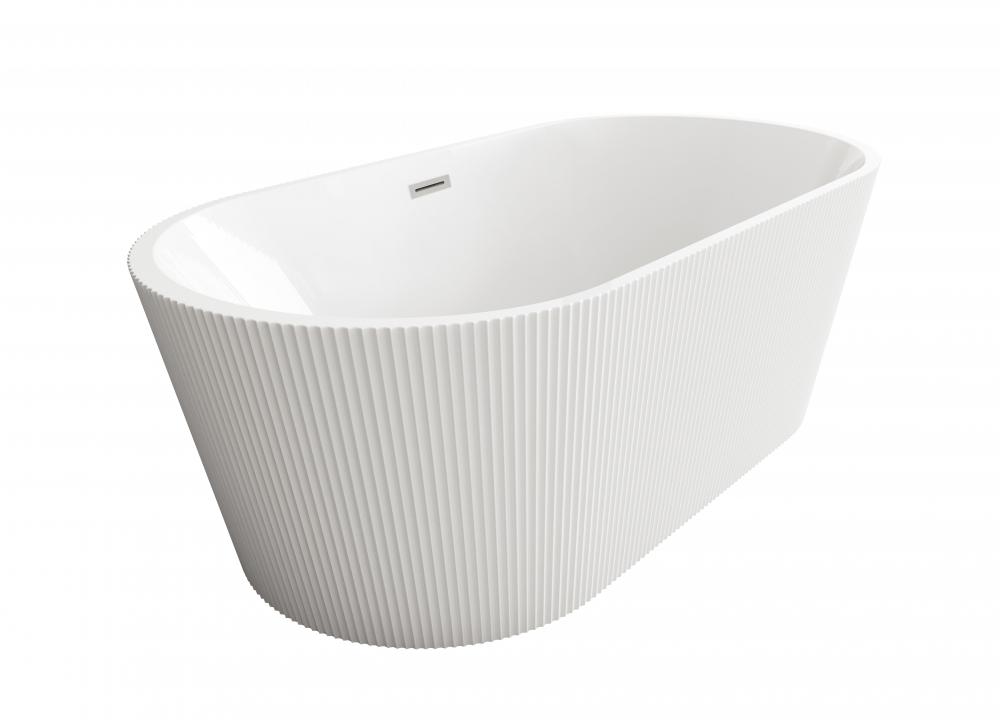 Elevate your bathroom’s aesthetic with this stunning freestanding soaking bathtub, featuring a vertical fluted exterior design that adds texture and sophistication to any space.