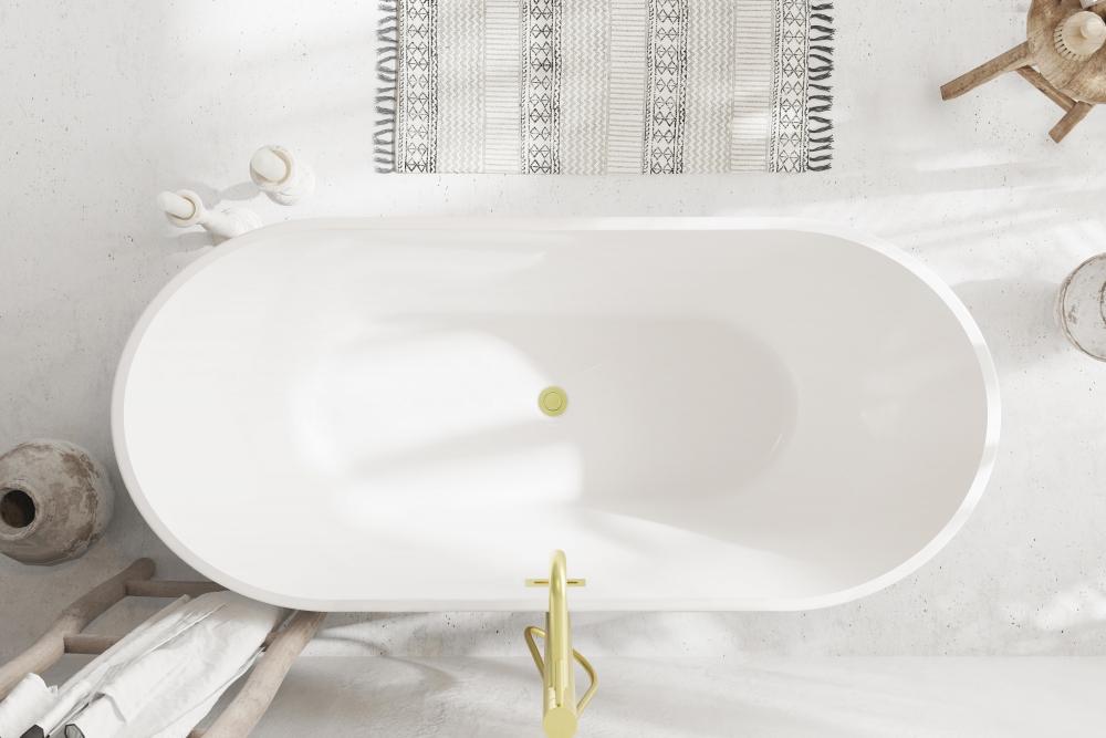 A double-ended freestanding bathtub offers symmetry and luxury. Both ends are gently sloped, allowing for comfortable reclining from either side.