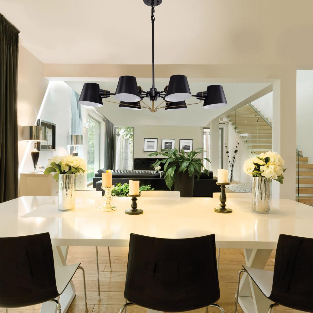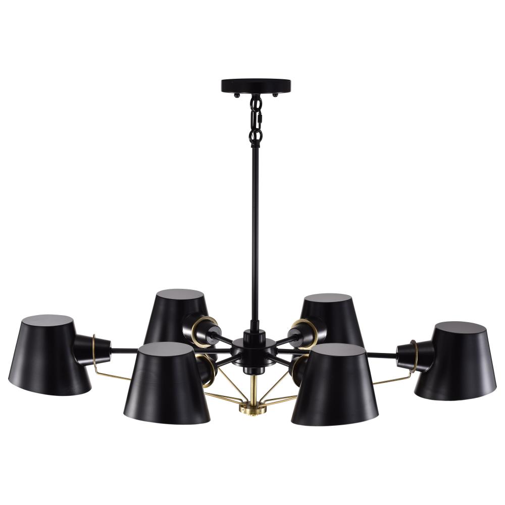 The Baxter 60-7386 six-light chandelier does not disappoint with its modern design and impressionable style. The black shades are finely cut at an angle and feature a white interior to maximize the light output. The lustrous burnished brass stems attach fr