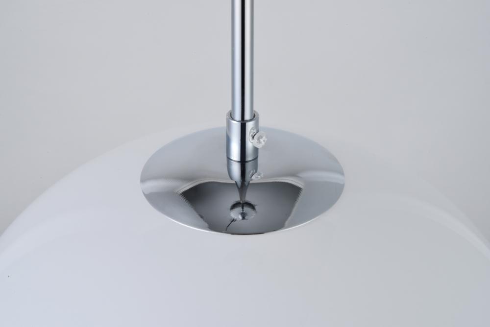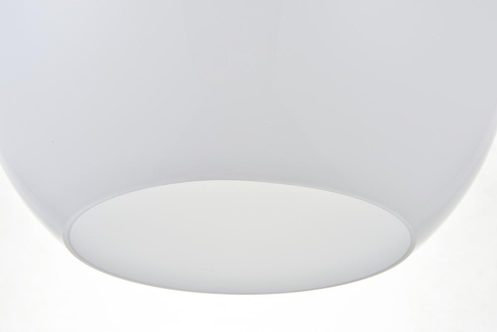 Feature 2: spherical frosted white glass shade with open center for easy bulb replacement