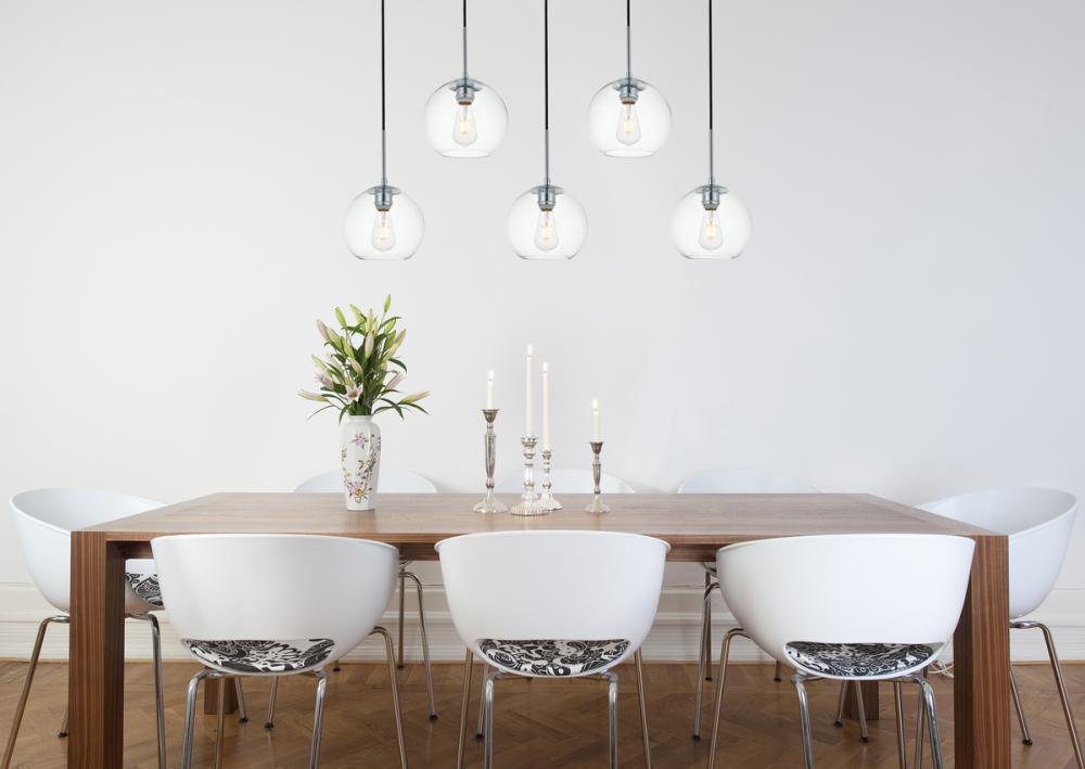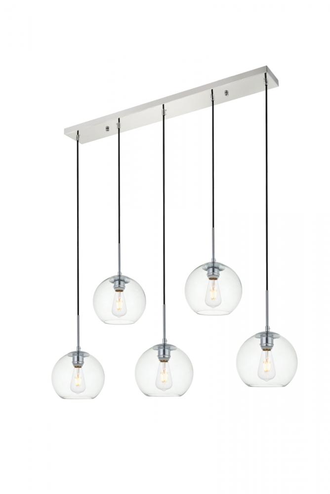 Refined style with a practical design, Baxter hanging pendant lamps bring cosmopolitan sophistication anywhere, especially to an entryway, office, bathroom, bedroom, or kitchen. The smooth iron frame features a rectangular canopy and comes in a chrome finish. Adjustable black cords allow you to vary the hanging height from 14 to 87 inches. Two staggered rows of five identical clear spherical glass shades remain open at the center to allow for effortless replacement of the filament-style bulbs (not included). Living in the big city has never been this easy.