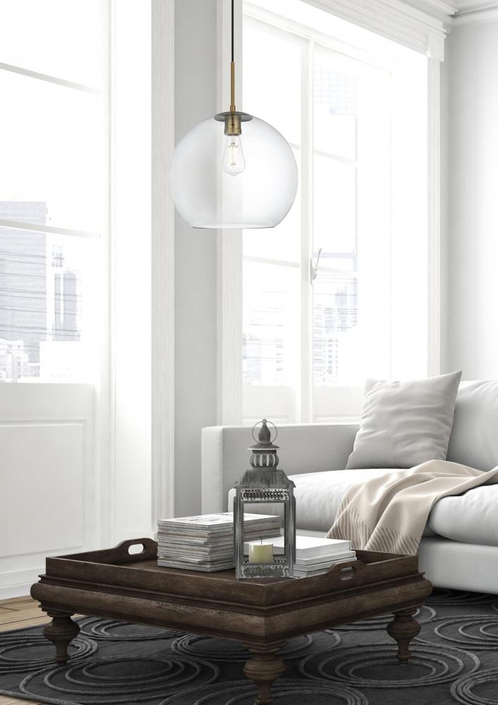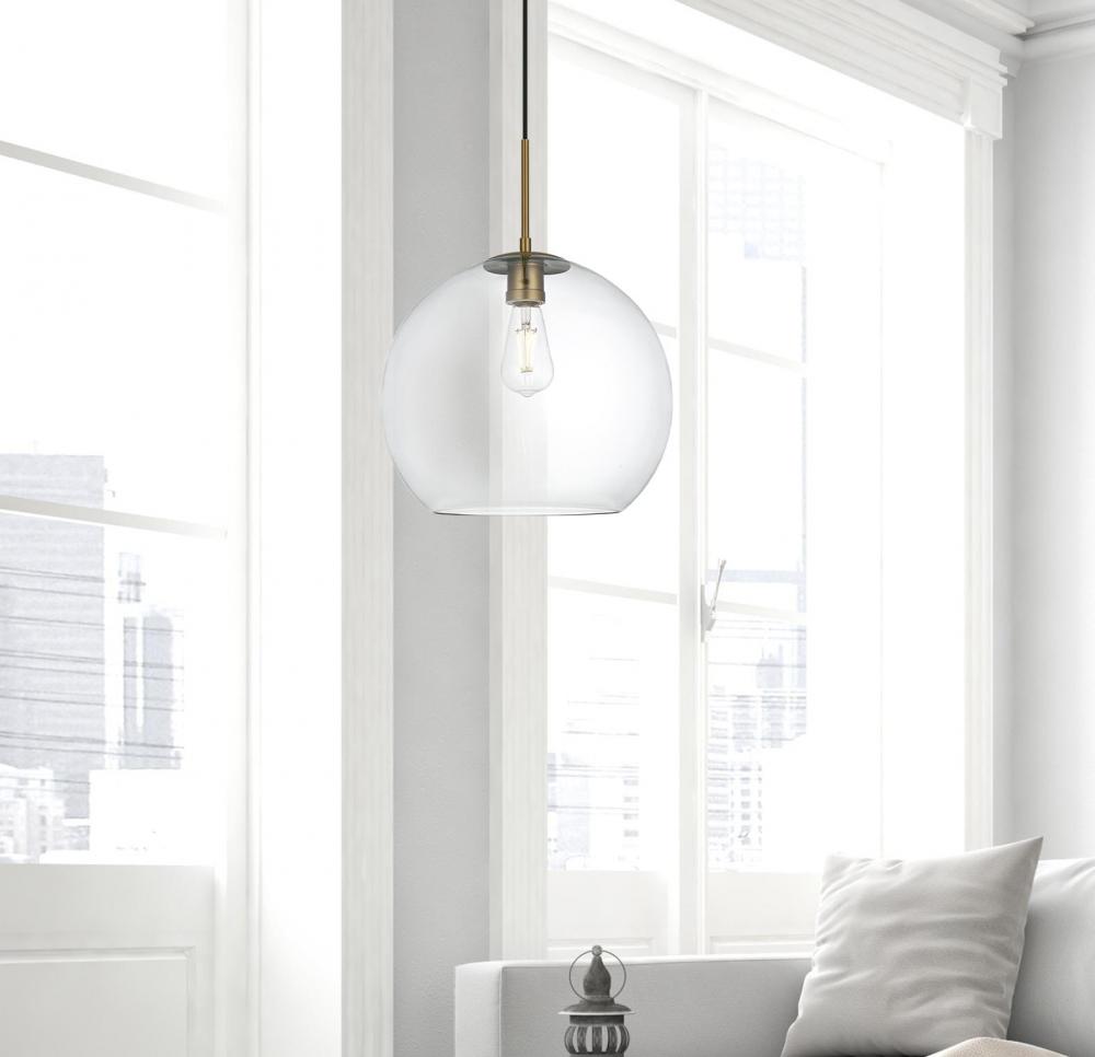 The Baxter hanging pendant light combines refined style with a practical design, adding cosmopolitan sophistication to any spaceābe it an entryway, hallway, bathroom, kitchen, or closet. The sleek iron frame, complete with a disk-shaped canopy, elegantly supports a clear spherical glass shade that stays open at the center, making bulb replacement effortless. Designed for those who love the look of big-city elegance, the Baxter pendant makes sophisticated living easy.