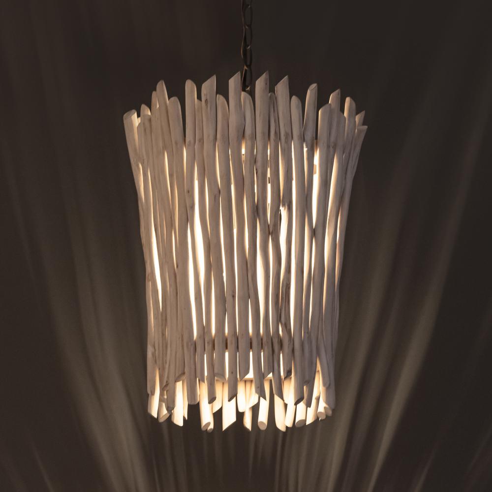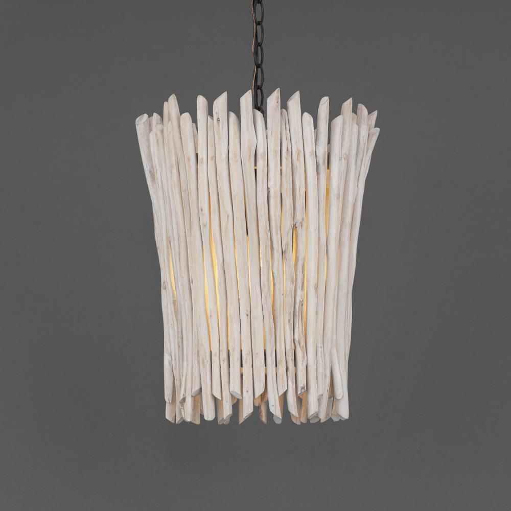 Staggered branches of eucalyptus are meticulously linked together to form a tapered bouquet shade, showcasing exceptional handcraftsmanship. Each branch is individually shaped, with the wood finished in a hand-applied Weathered White that beautifully compl