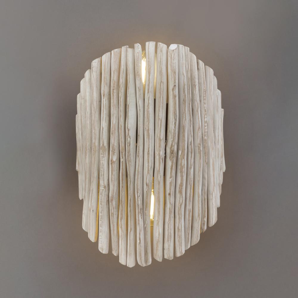 Staggered branches of eucalyptus are meticulously linked together to form a tapered bouquet shade, showcasing exceptional handcraftsmanship. Each branch is individually shaped, with the wood finished in a hand-applied Weathered White that beautifully compl