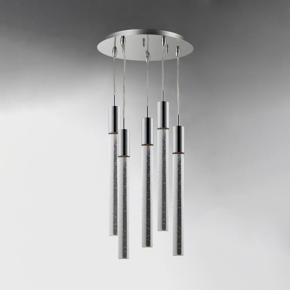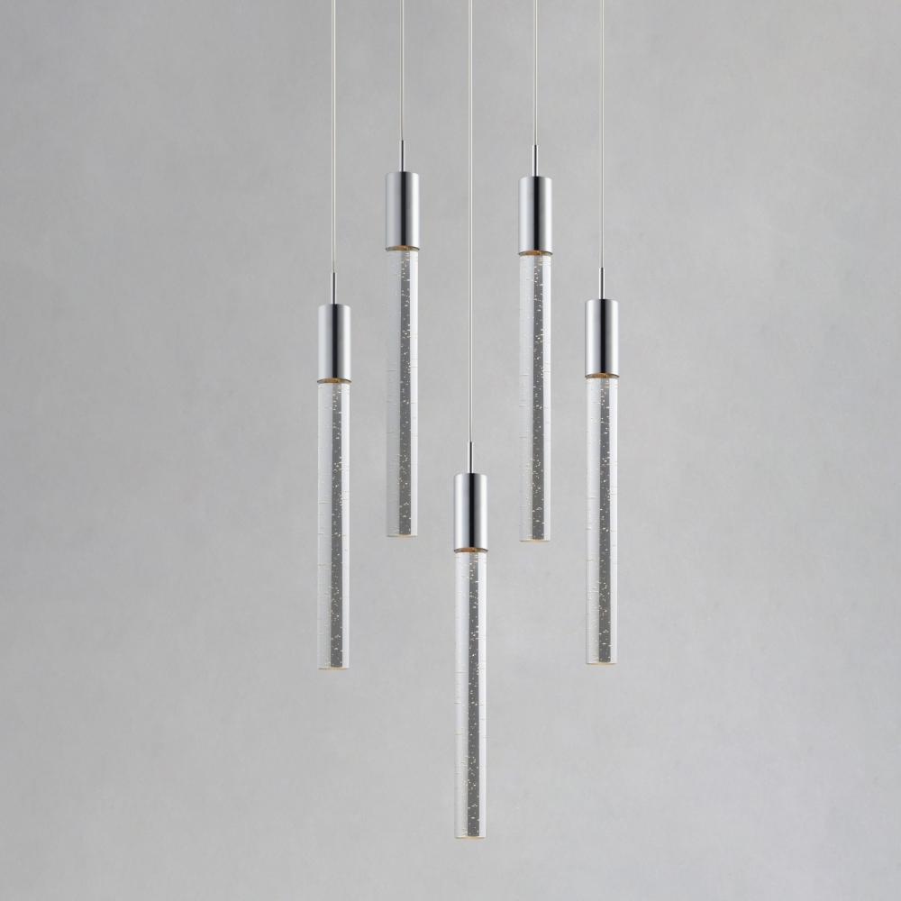 Our ever popular collection has grown up. Large scale fonts of clear bubble glass are suspended from Polished Chrome supports with no visible screws. Top of the line LED modules illuminate the glass from top to bottom with excellent color rendering.