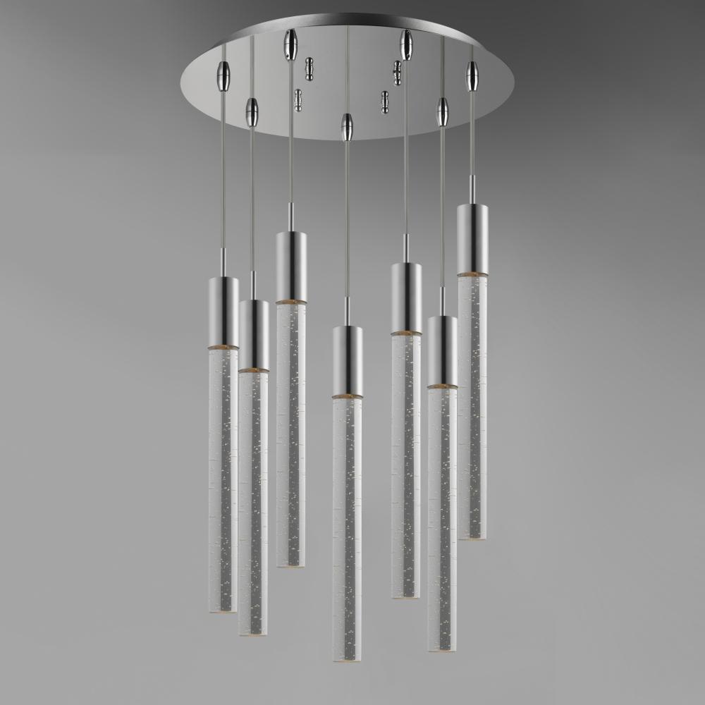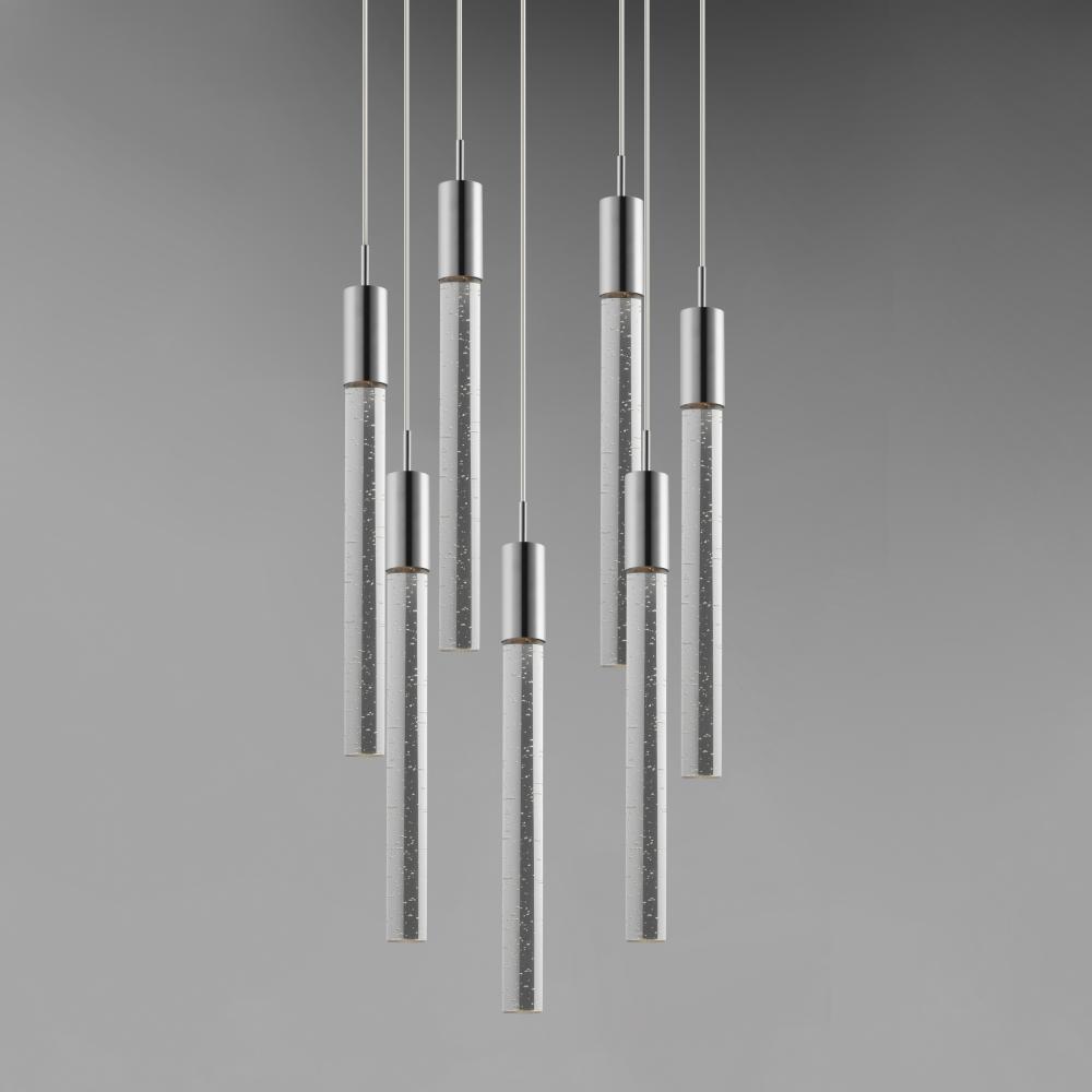 Our ever popular collection has grown up. Large scale fonts of clear bubble glass are suspended from Polished Chrome supports with no visible screws. Top of the line LED modules illuminate the glass from top to bottom with excellent color rendering.