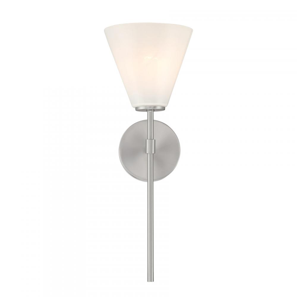 This Savoy House Blair 1-light sconce is oh so versatile! It is finished in Satin Nickel and holds a shade of spectacularly swirling strie glass. Blair is 17.5" in height, 6.25" in width and extends 8.25" from the wall. Uses one standard size bulb of up to 60 watts. Bulb not included. This sconce is damp area rated.