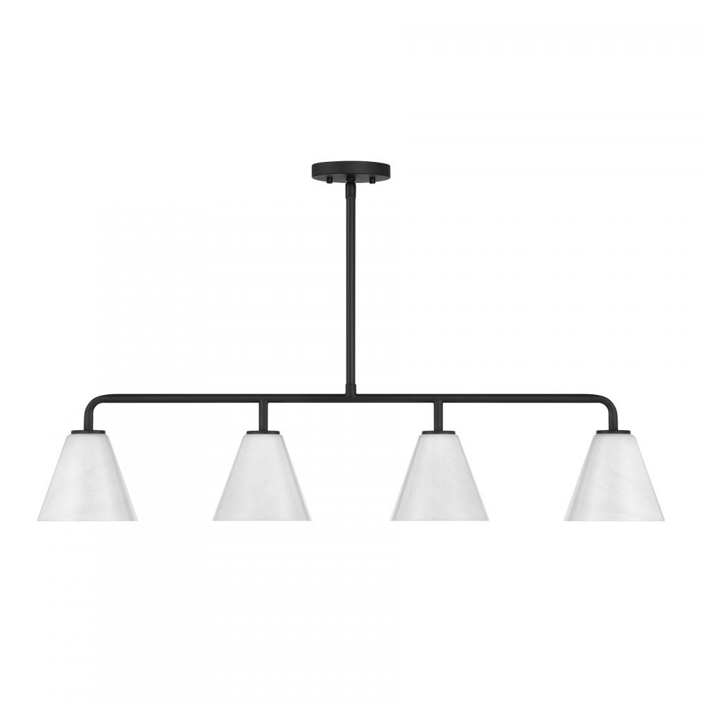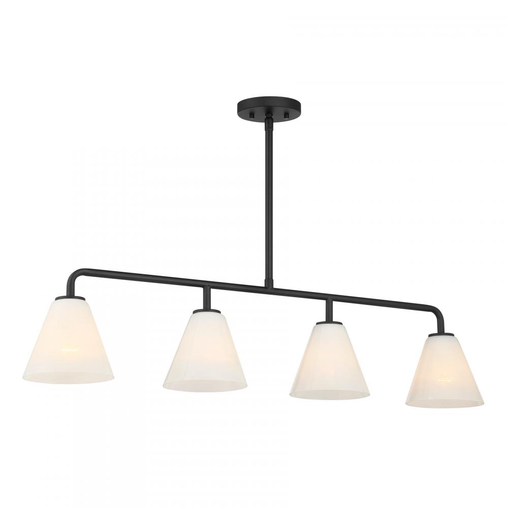 This Savoy House Blair 4-light linear chandelier is oh so versatile! It is finished in Matte Black and holds shades of spectacularly swirling strie glass. Blair is 40" in length, 6.25" in width and has an adjustable height ranging from 9" to 63". Uses four standard size bulbs of up to 60 watts per bulb. Bulbs not included. Comes with four 12" downrods and one 6" downrod.