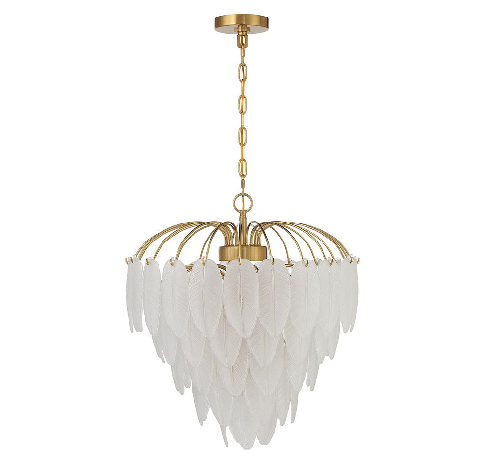 The Savoy House Boa 6-light chandelier was designed by Breegan Jane, an award-winning interior designer and TV host based in Los Angeles. Accordingly, Boa is infused with luxurious Old Hollywood glamour. Frosted glass feathers cascade down in overlapping rows, creating a look that is sure to turn heads, and the Warm Brass finish is a perfect example of how Breegan uses metallics to elevate her designs. Boa is 24" in height and 22" in width. It uses six candelabra size bulbs of up to 60 watts per bulb. Bulbs are not included.