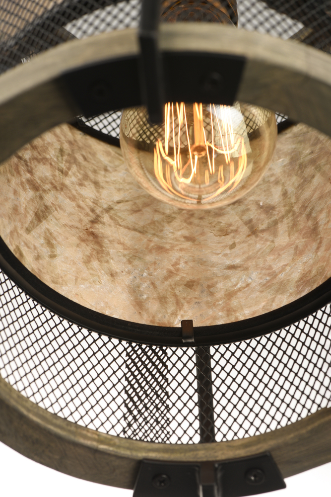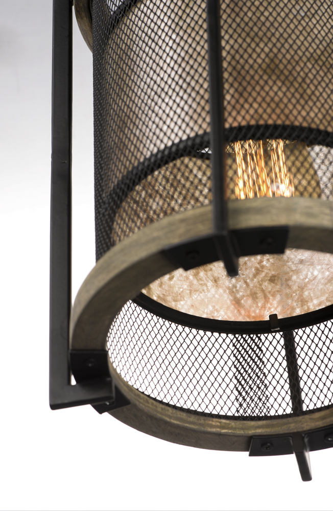 Frames of wood finished in Barn Wood and cradled by Black metal brackets were used to create this beautiful rustic design. The Black mesh screen is accented with a band of mica and Antique Brass sockets to deliver rustic charm with all the right fixings.
